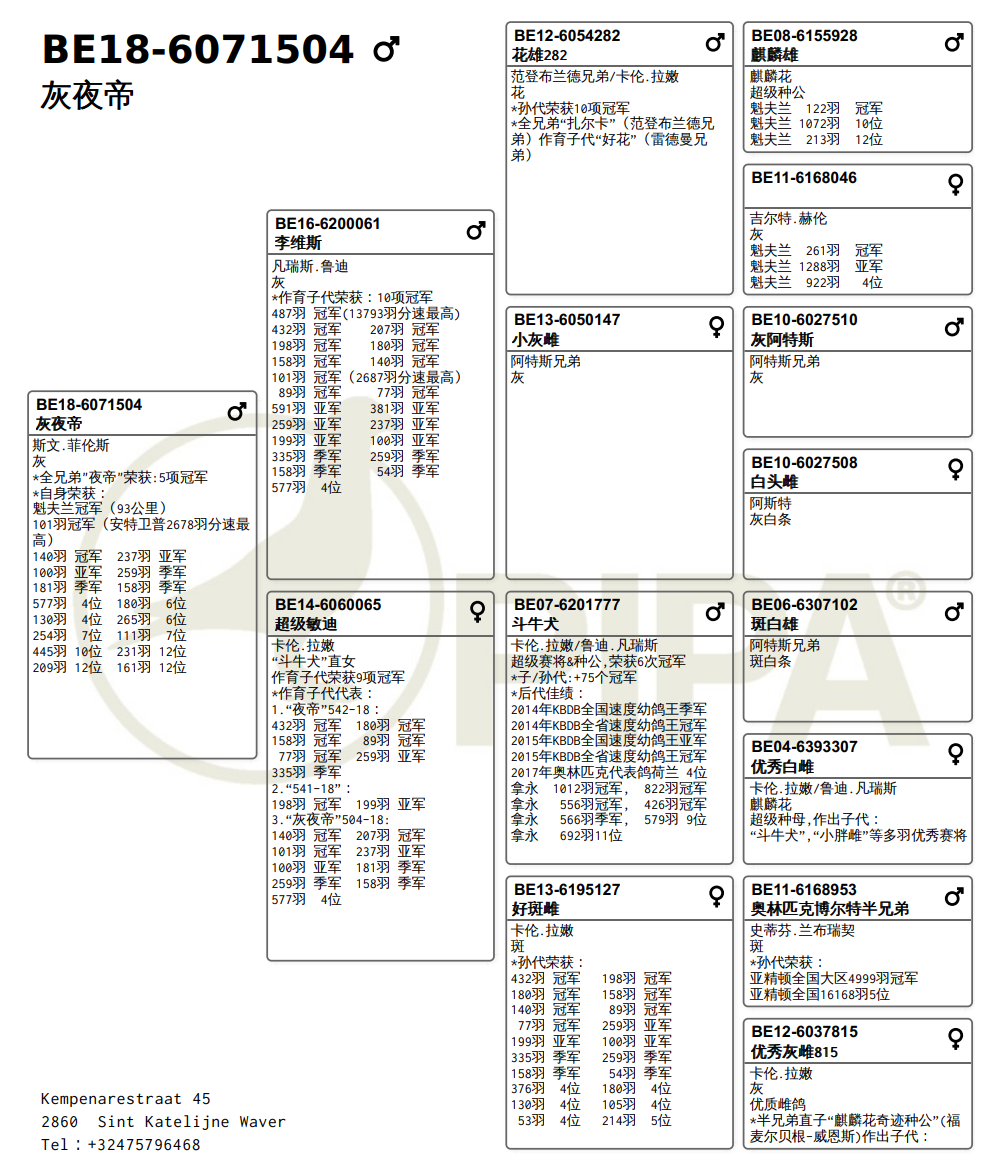 “灰夜帝”是“夜帝”(BE18-6071542)全兄弟,“夜帝”赢得5项冠军并且荣获洪贝克 'De Witte Duivin' 俱乐部成鸽王冠军。