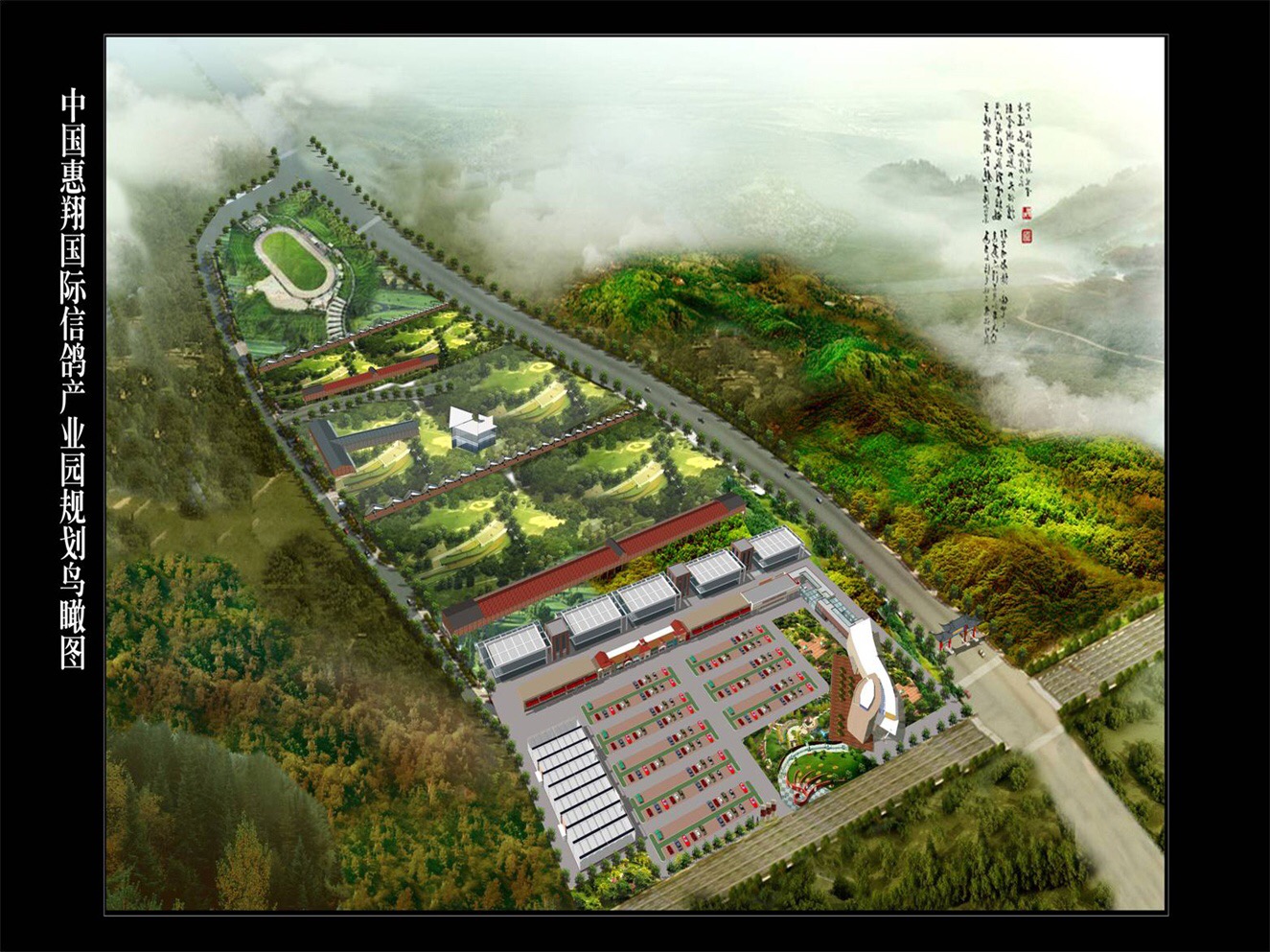 园区总规划占地180亩,依托城区西南边缘特有的丘陵地貌,居高临下傍山而建、地形起伏坡峰错落、草木茂盛山水相依,绿化率高达80%,景观设计春有花如沐春风、夏有荫如享夏夜、秋有果如望秋月、冬有绿如浴冬阳。现已作为地标性建筑的园区一期总投资1.3亿,建有大型国际前沿赛鸽公棚、信鸽文化主题会所、赛鸽历史博物殿堂、军事通信军鸽基地、铭鸽特比种赛中心、颁奖拍卖荣耀大厅等产业设施及文创配套。