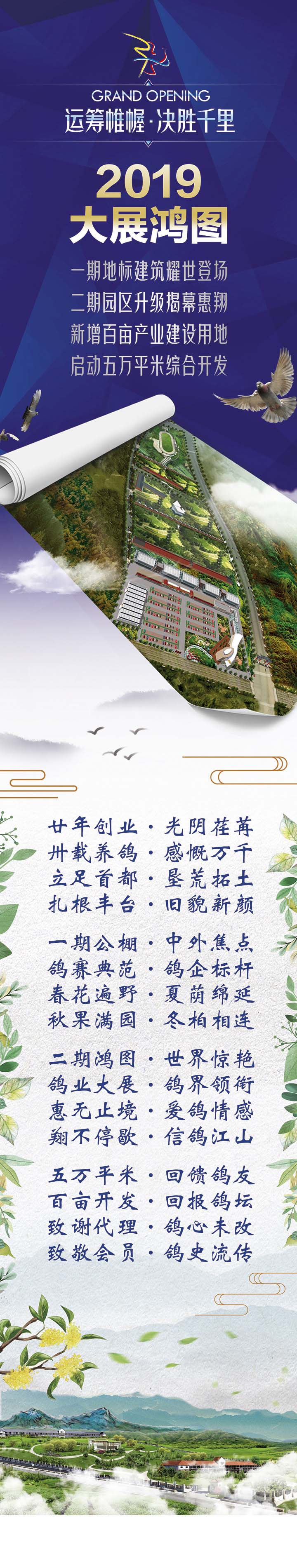 在各级政府政策扶持及各方同仁不懈努力下,近期备受各界关注的惠翔国际信鸽产业园二期开发获得批准、二期项目正式启动。园区整体新增百亩产业用地,同时获批五万平米建设指标,将开工兴建全球最大、国际领先的信鸽产业综合体。为避免施工干扰以保障训养环境,一期已竣工落成并投入使用的惠翔公棚,将自明年起继续为全国鸽友提供权威专业服务及高端竞翔平台。
