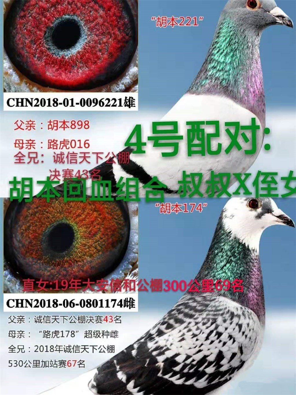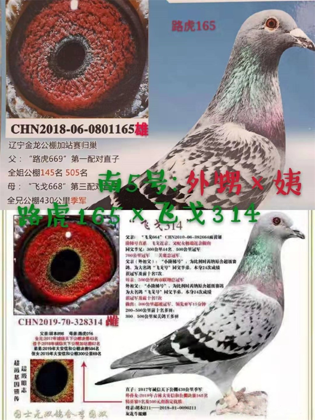前几日,参加公棚比赛的鸽子出完了。开始着手研究近亲回血配对。今年送公棚参赛的配对,其中有两对是近亲配对。分别是:路虎165ⅹ飞戈314和飞戈769ⅹ飞戈766。前者是外甥ⅹ姨的关系,后者是侄子x姑姑的关系,前者两轮出了三羽都送公棚了,后者只出一只也送公棚去比赛。
