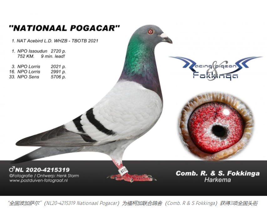 2021年最重要的援外成绩就是“全国波加萨尔”。这羽雄鸽由福柯加联合鸽舍使翔,他们与艾辛加一样居住在哈克玛。“全国波加萨尔”取得了惊人的3项全国头衔: 2021年WHZB/TBOTB全国长距离鸽王冠军 2021年“王牌精英”全国长距离鸽王冠军 长距离之窗当日归全国鸽王冠军这羽超级鸽的父亲“希望号回血”(NL18-1392199 Inbred Hope)。这羽雄鸽又是“哈利路亚新希望”(NL16-4280780 Hallilujah's Hope)的直子,出自“哈利路亚”(NL15-1850078 Hallilujah)X“新希望”(NL12-4245276 New Hope),这是“艾丝米王子”的全兄弟。 杨.胡曼斯拥有超凡出众的顶级鸽。这羽雄鸽获得2020年查特顿北方联盟15,639羽冠军。2021年“西尔维”获得NPO全国长距离鸽王12位。“西尔维”的父亲是与杨.胡曼斯合作育种作育的。他的世界名鸽“哈利”与“艾丝米”(NL12-1005204 Esmee,2014年WHZB-TBOTB全国鸽王冠军和2015年布达佩斯奥林匹克代表鸽)配对。“西尔维”的父亲是超级种鸽“哈利路亚”的全兄弟。 胡曼斯比利时战队还拥有一羽绝对超级战将。“(新)哈利直孙女”获得2021和2020年PIPA排行榜查特路赛最佳赛鸽冠军。如同“西尔维”一样,“艾丝米”是这羽新超级明星的祖母之一。19-973以如下成绩的最佳头衔: 2020年查特路 I 安特卫普全省5121羽冠军/全国33833羽7位 2020年查特路III全国 2721羽4位 2021年查特路(盖雷)B4大区 1005羽13位 2021年查特路I 全国24617羽26位 以艾辛加赛鸽取得佳绩的另外一位鸽友是亚里.帝克特拉(Arie Dijkstra)。他的一岁雌鸽“理智灰”(NL20-4215131 Sensible Blue)获得NPO圣斯602公里5706羽冠军。这羽赛鸽获得11(北)赛区苏尔丹563公里4297羽34位。“理智灰”的父亲出自“史文”(NL10-1031410 Sven)X “艾辛加回血”(NL16-1003331 Inbred Esmee)。 下一个援外成绩让我们来到西兰省的泰尔讷普(Terneuzen),具体来说就是希勒兄弟。他们的特别赛鸽NL19-3908080名为“阿得里安”。这羽神奇雄鸽获得莫伦10375羽冠军。现在他获得冯特内Samenspel Midden 2511羽冠军。“阿得里安”的父亲是“艾丝米直子”(NL14-1393325 Son Esmee)。从名字可以看出他是奇迹赛鸽“艾丝米”的直子。 杰拉德.考夫曼也以艾辛加赛鸽取得成功。杰拉德特别喜欢在2周内取得2项NPO冠军的“艾丝米王子”(NL17-4289807 Prince Esmee)。“艾丝米王子”的1羽孙代为考夫曼获得NPO雷米斯6036羽亚军。杰拉德还有“艾丝米王子”的2羽兄弟鸽“阿比”(Abe)和“佳迪”(Gardi),他们的子代取得了如下成绩: 雷米斯4060羽冠军(东北荷兰赛区5-8联合会),父亲“阿比”是“艾丝米王子”的兄弟。洛里斯全国第4大区3455羽7位,父亲“佳迪”是“艾丝米王子”的兄弟。NPO雷米斯6036羽季军,父亲出自合作育种“艾丝米王子”X “阿朵拉”(Adora)。 2021年蒂尔德和乔克在自己的鸽舍也取得了不俗的表现。他们获得NPO圣斯5706羽亚军(母亲是“艾丝米”的孙代)、NPO洛里斯3039羽季军(“艾丝米”直孙)、NPO洛里斯3038羽6位和NPO沙隆2445羽幼鸽8位。此外他们还获得通厄伦2952羽冠军(父亲是“艾丝米王子”的兄弟)。在瓦尔登地区(130位鸽友)他们获得综合最佳鸽舍冠军。从2013年至今,他们一直获得地区非指定鸽冠军或亚军(2019年是例外,因为他们拍卖全部赛鸽后没有任何成鸽参赛)。对于这样的表现,恐怕没有人还会抱有怀疑。