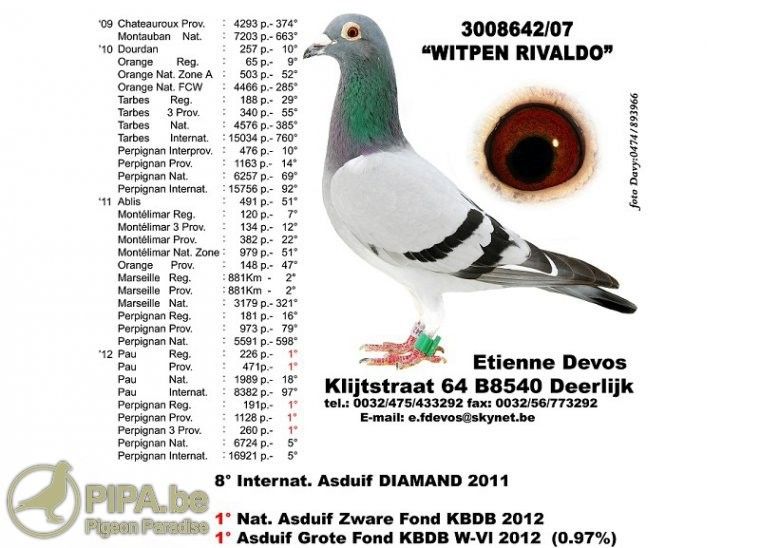比利时赛鸽巨匠-依天.迪沃斯 Devos Etienne,在2015年去世,他曾红极一时的「小迪迪」鸽系,在本舍最发挥的後代,当属荣获2012年KBDB超长距离鸽王全国冠军的「白羽利万多」