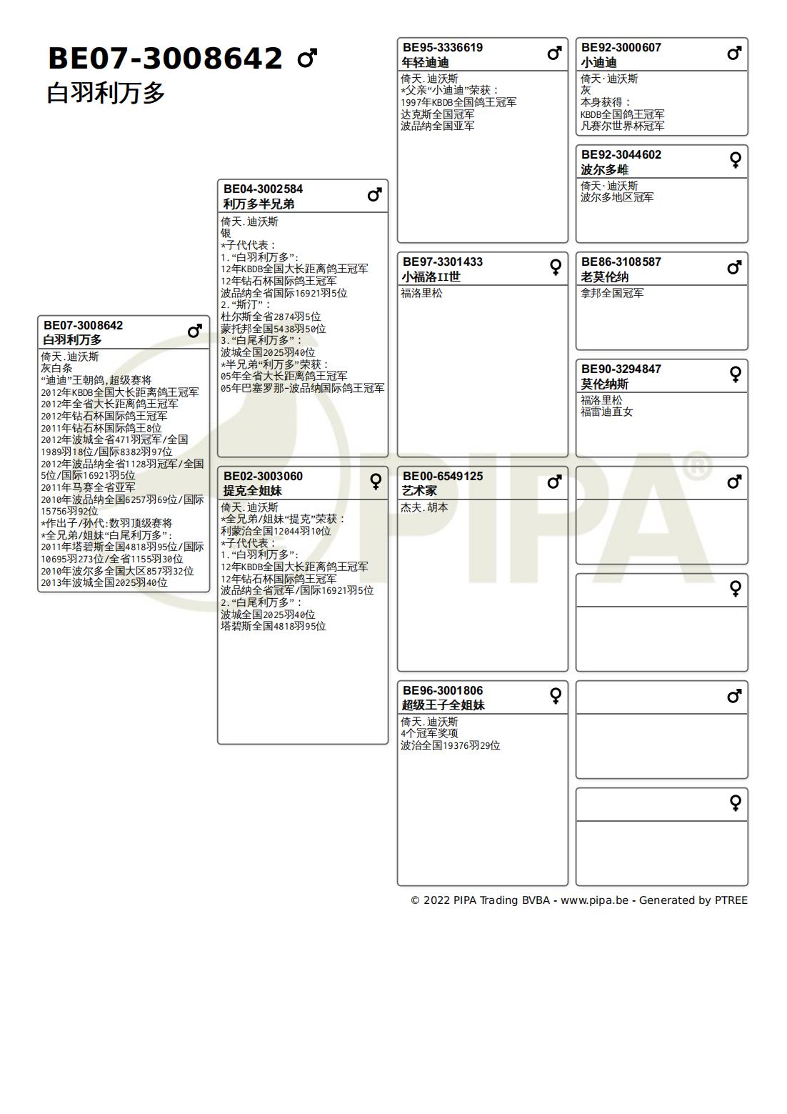 B08-3005126 「白尾利万多」获得2011年鸽报钻石鸽王国际冠军,B06-3000729 「斯汀」入赏布利福全国9位,以及波提尔冠军的B08-3005220「邦比」,同样具有优异的鸽王血系和育种价值。
