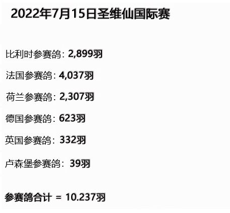 值得一提的是此次比赛中各国鸽友踊跃参加,参赛鸽羽数达到10237羽,相比去年集鸽羽数有了较大的提升。其中法国参赛鸽多达4037羽,赛况激烈,精彩绝伦。