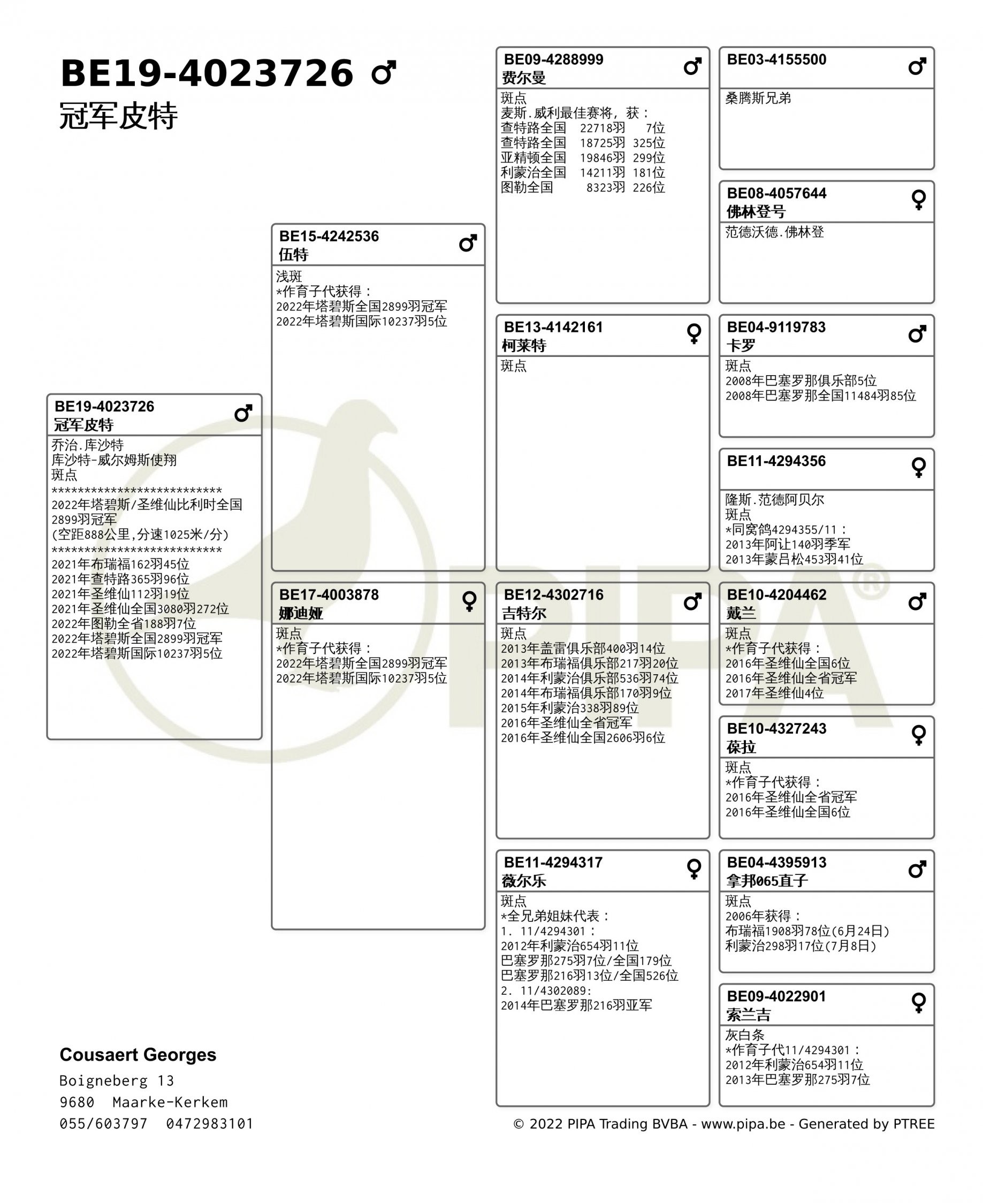 库沙特·威尔姆斯获得了这次圣维斯国际赛比利时成鸽2899羽全国冠军,同时也是国际10237羽5名。冠军鸽“皮特“在星期五21:46CEST完成打钟,空距为888.705公里,平均分速为1025.98米/分。“皮特“此前参加了不少比赛,并取得2021年布瑞福162羽45位,2021圣维仙全国3080羽272位的成绩。”皮特“的外祖母“薇尔乐”全兄弟姐妹获得2014年巴塞罗那216羽亚军。