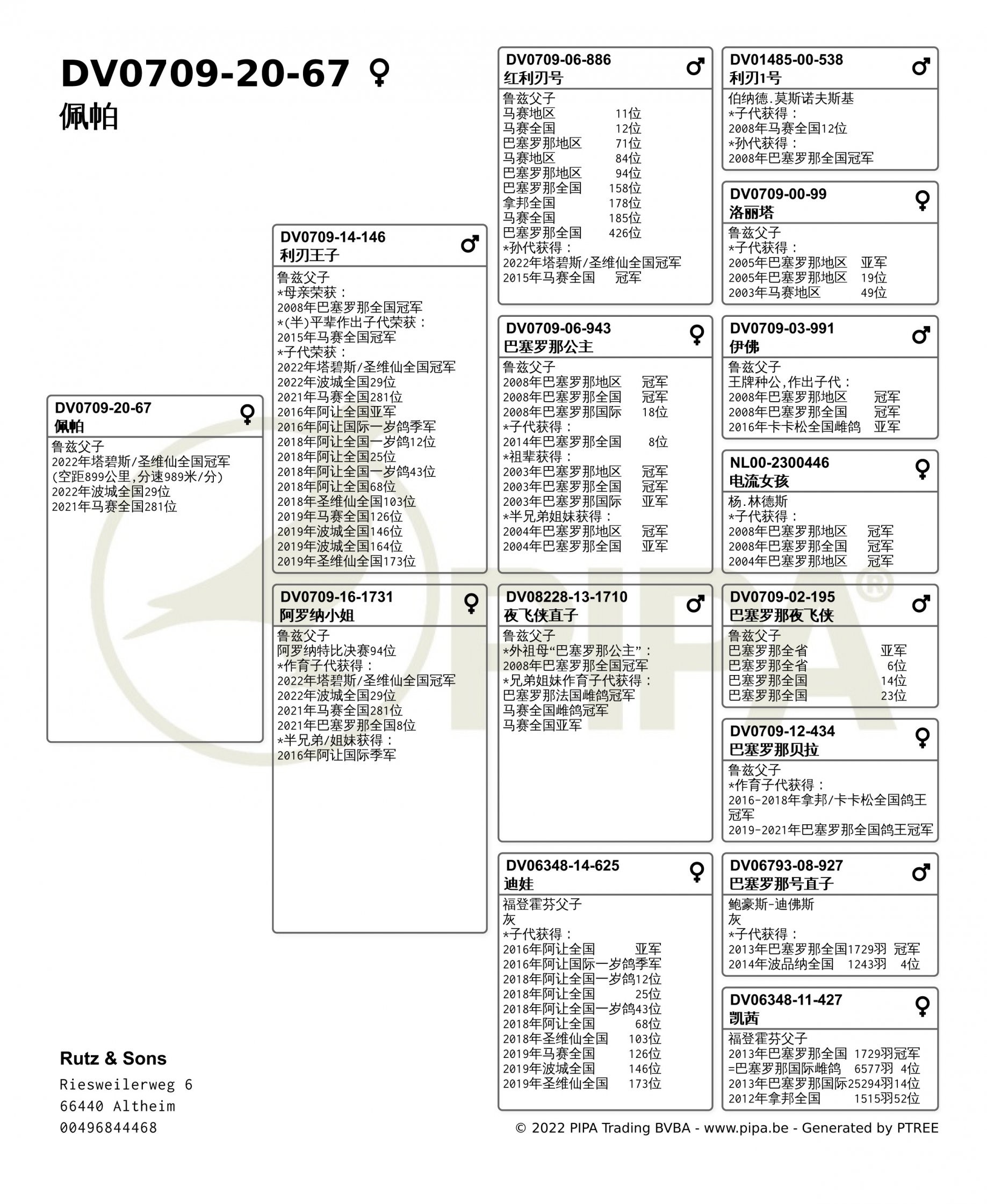 “佩帕”的母亲是”阿罗纳小姐”(DV0709-16-1731),获得阿罗纳特比决赛94位,作育子代获得2021年巴塞罗那全国8位等成绩。