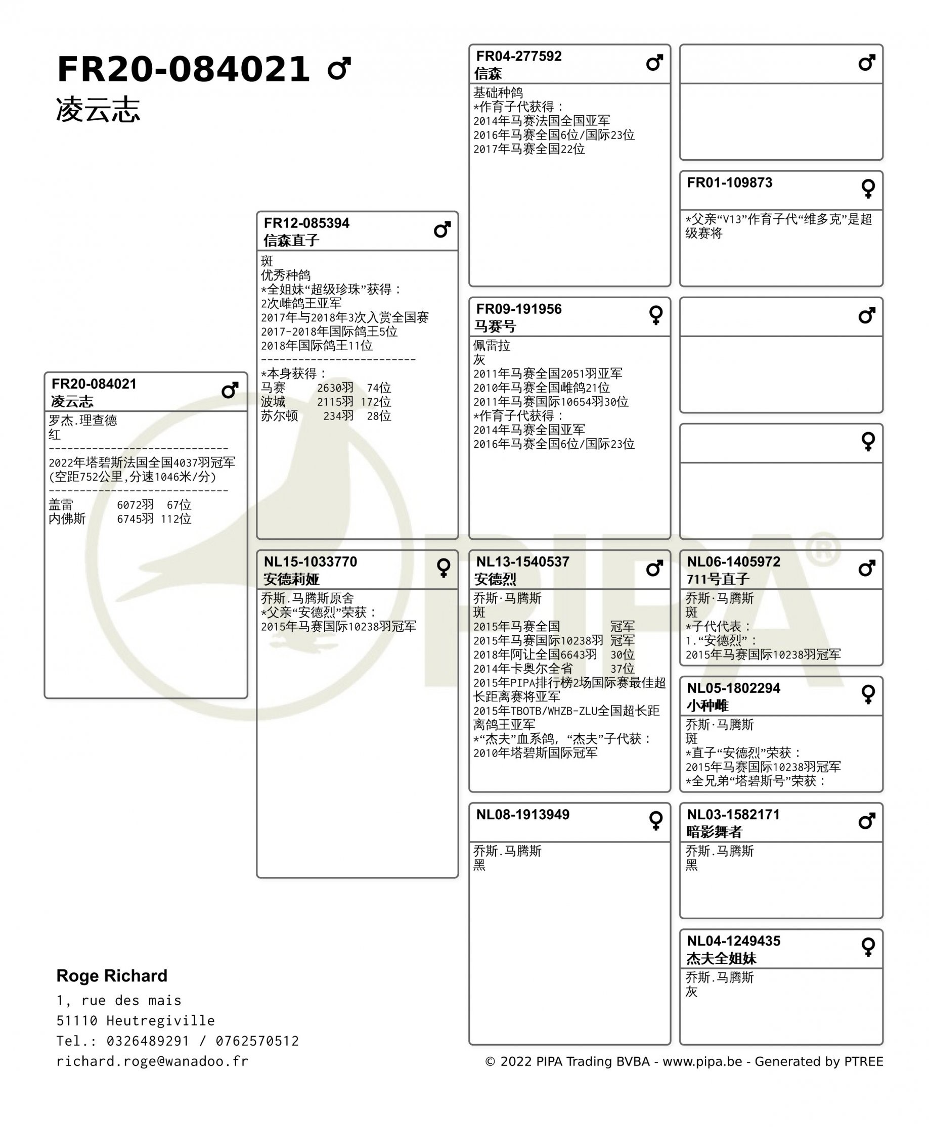 “凌云志”的母亲是“安德莉娅“(NL15-1033770),出自乔斯·马腾斯原舍,她的父亲”安德烈“获得马赛国际10238羽冠军。