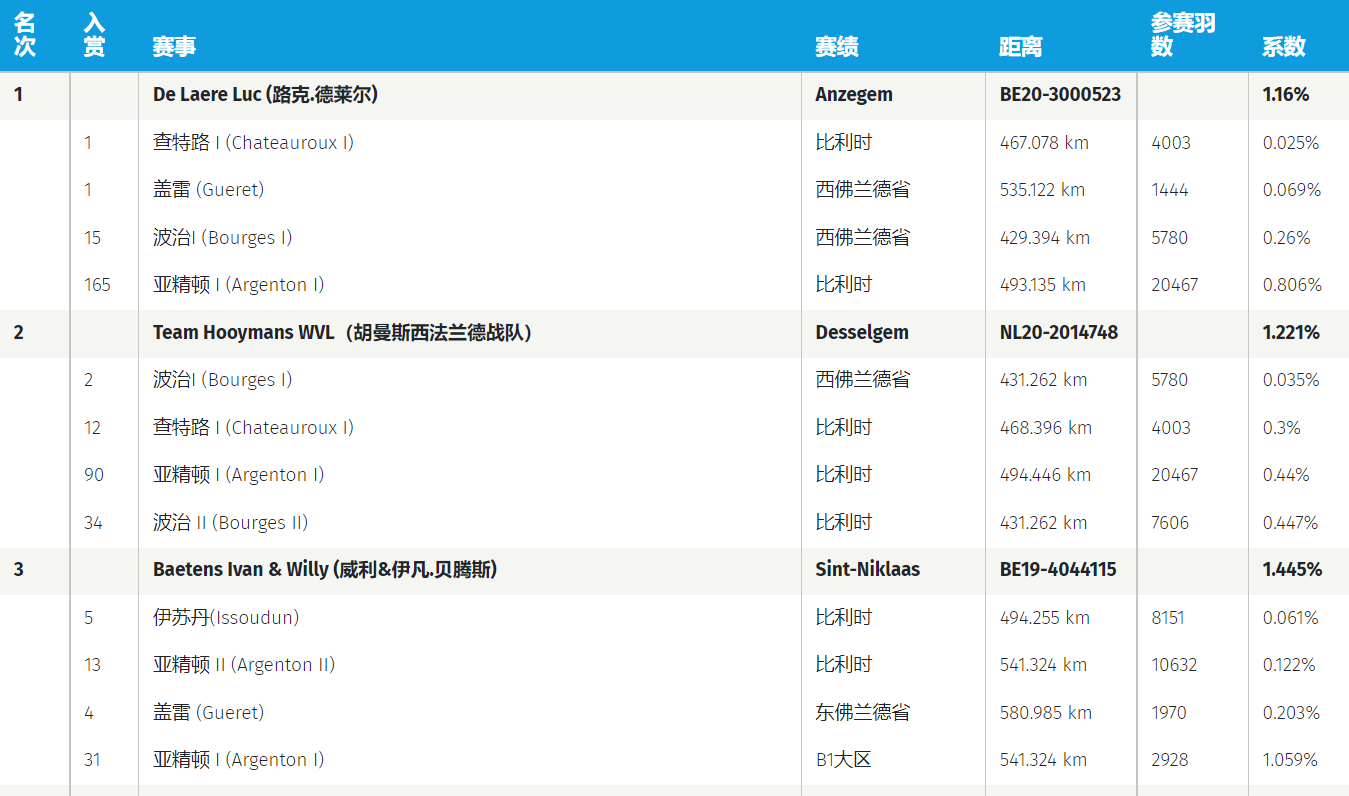 近日2022年比利时KBDB全国中距离一岁鸽组鸽王初步赛绩公布。榜单统计了4场中距离比赛最佳成鸽。波治I 、 亚精顿 I 、 亚精顿 II 、伊苏丹、盖雷、拉索特年、波治 II和 查特路 I 已经发布的全国、大区和全省成绩被计入本项榜单。当前排名前3的分别是路克.德莱尔、胡曼斯西法兰德战队、威利&伊凡.贝腾斯。