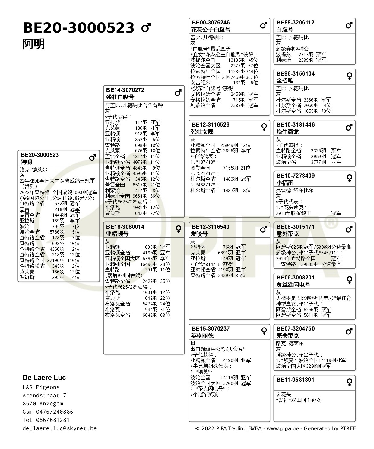 路克·德莱尔的冠军鸽是一羽灰羽雄鸽,环号BE20-3000523,凭借查特路 I4003羽全国第一名,盖雷1444羽全省第一名,波治I5780羽全省15名,亚精顿 I20467羽全国165名的成绩排名第一,获得全国中距离成鸽组鸽王冠军。
