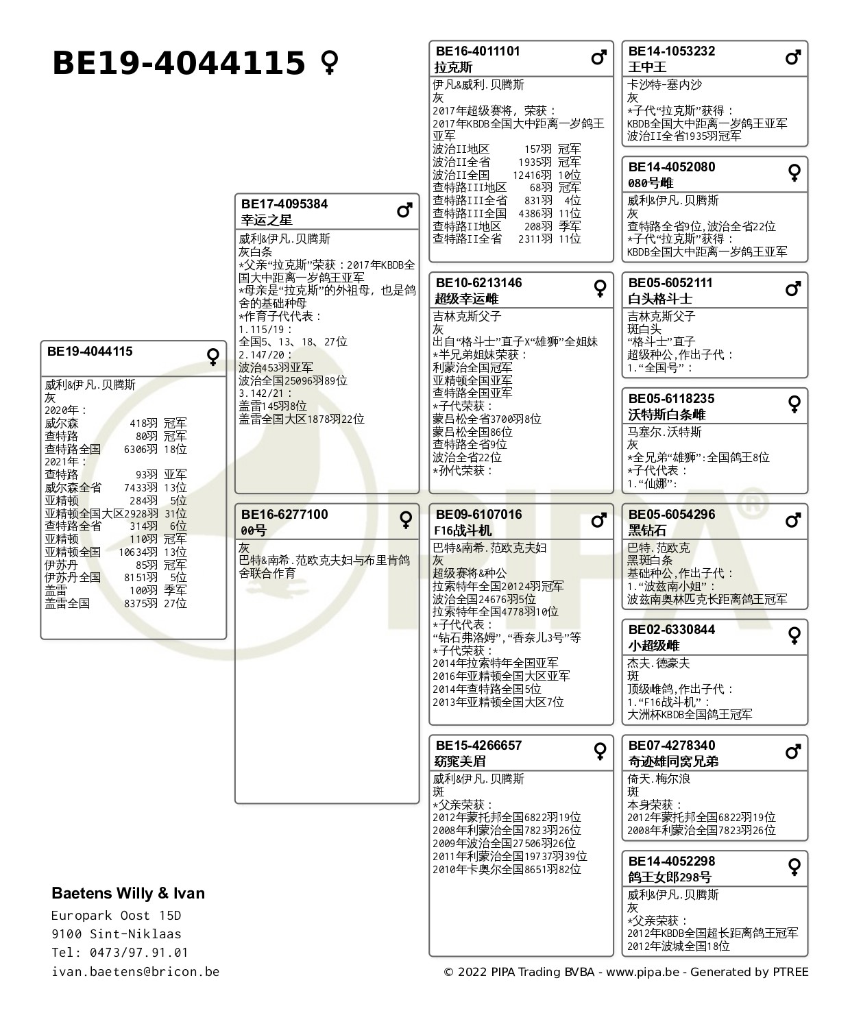 威利&伊凡.贝腾斯获奖鸽是一羽灰羽,砂眼雌鸽,环号BE19-4044115。从赛季开始以来,这羽赛鸽就展现了惊人的实力,最终收获KBDB全国中距离成鸽组鸽王季军的称号。获奖鸽凭借伊苏丹8151羽5位,亚精顿II10632羽13位,盖雷1970羽4位,亚精顿I2928羽31位取得该头衔。