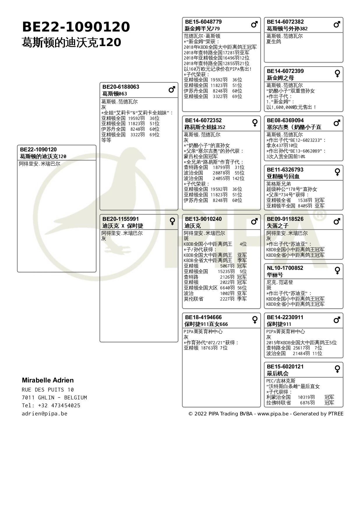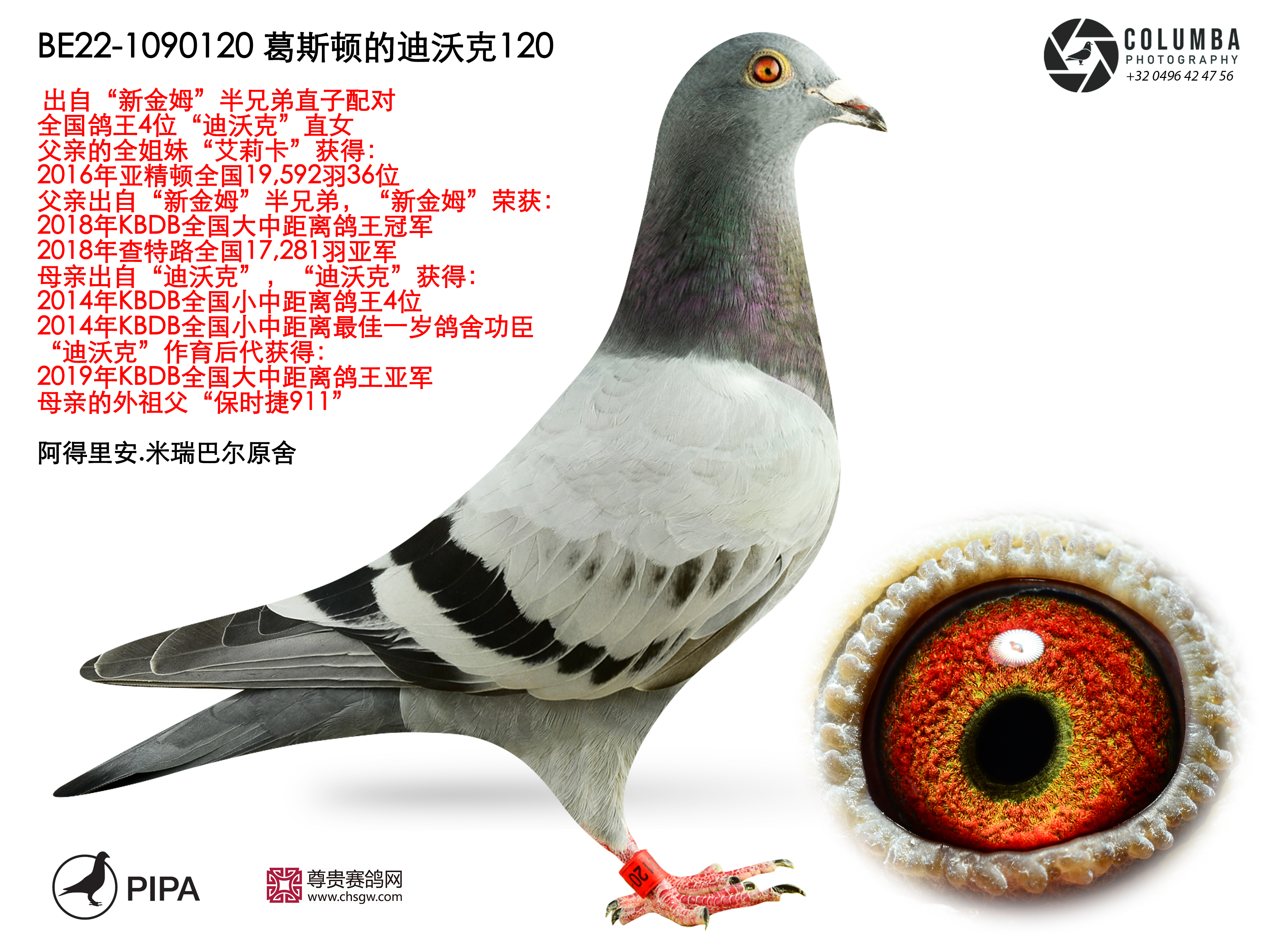“葛斯顿的迪沃克120”(BE22-1090120)就是这样赛鸽,他是阿得里安·米瑞巴尔的原舍鸽。出自“葛斯顿063”x“迪沃克 X 保时捷”的配对。父亲“葛斯顿063”是“新金姆”半兄弟直子。全姐妹全姐“艾莉卡”&“艾莉卡全姐妹”获得亚精顿全国19592羽36位,亚精顿全国11823羽51位等成绩。母亲“路易斯全姐妹352”是“奶酪小子”的直孙女。