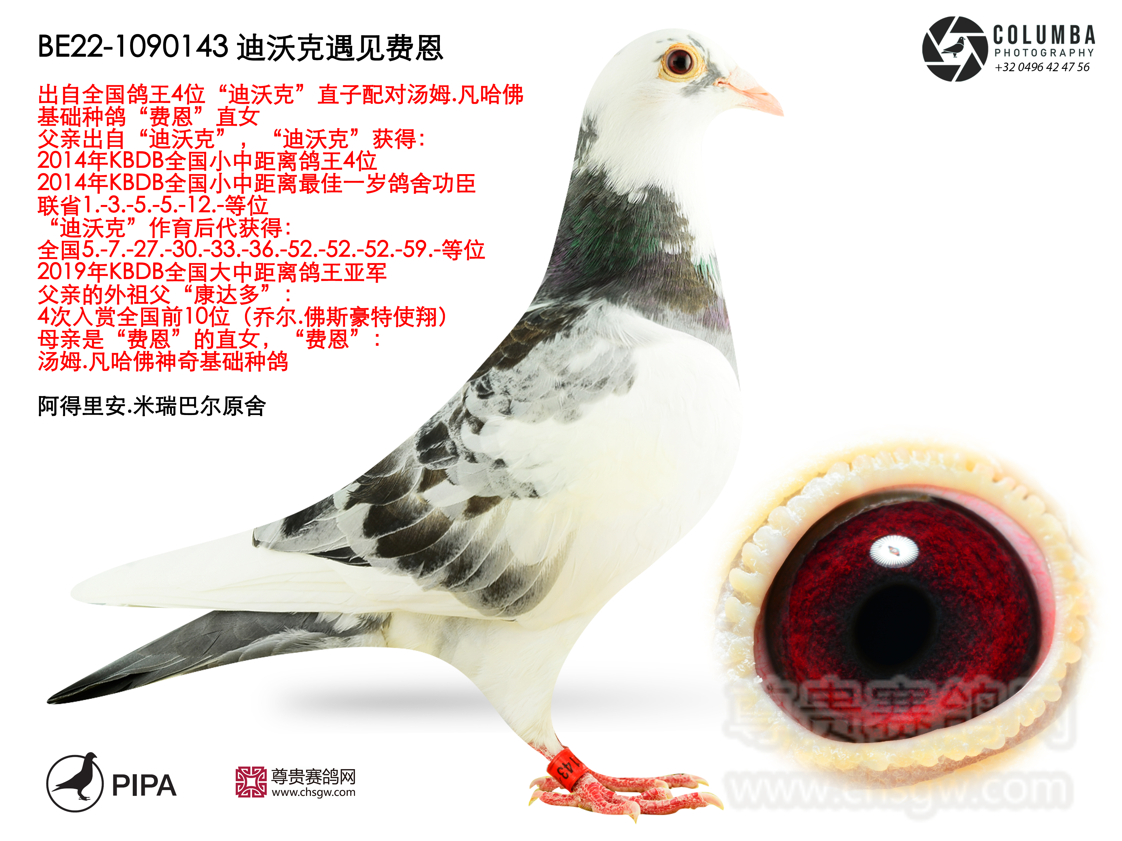 “迪沃克遇见费恩”是阿得里安.米瑞巴尔舍内的优秀赛鸽,出自“德沃克”x“费恩直女338”配对。父亲“德沃克”是KBDB全国小中距离鸽王4位“迪沃克”直子。父亲“迪沃克”作育子代获得KBDB全国大中距离鸽王亚军,KBDB全省大中距离鸽王季军,亚精顿5067羽冠军等优秀赛绩。母亲“德瓦妮”出自乔尔.佛斯豪特原舍,2016-2018年10次入赏全国赛。获得安格拉姆4525羽77位,波治地区166羽冠军,波治全省1032羽季军等赛绩。外祖父是大名鼎鼎的“康达多”,出自乔尔.佛斯豪特原舍,获得2018年KBDB全国长距离鸽王10位,是比利时史上最佳长距离赛将之一。最终以天价200000欧元售出!