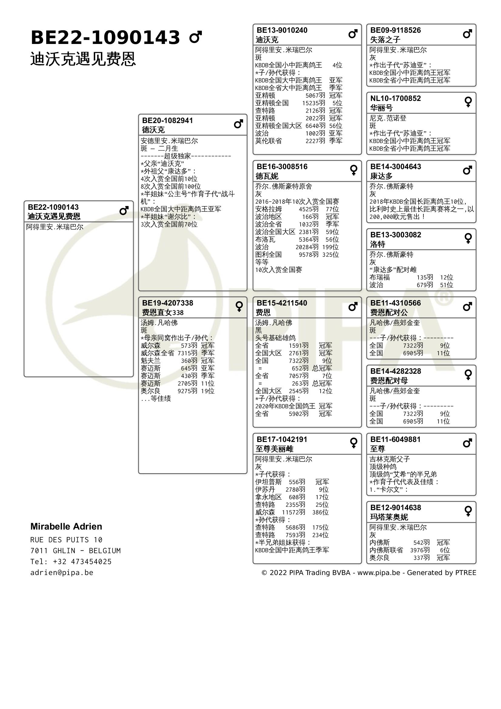 母亲“费恩直女338”出自汤姆.凡哈佛舍内,父亲是头号基础雄鸽“费恩”,获得全省1591羽 冠军,全国大区2761羽冠军,全国7322羽9位等成绩。作育子孙代获得2020年KBDB全国鸽王冠军。母亲是“至尊美丽雌”,作育子代获得伊坦普斯556羽冠军,伊苏丹2780羽9位,拿永地区608羽17位等成绩。父亲是顶级种鸽“至尊”,顶级鸽“艾希”的半兄弟。