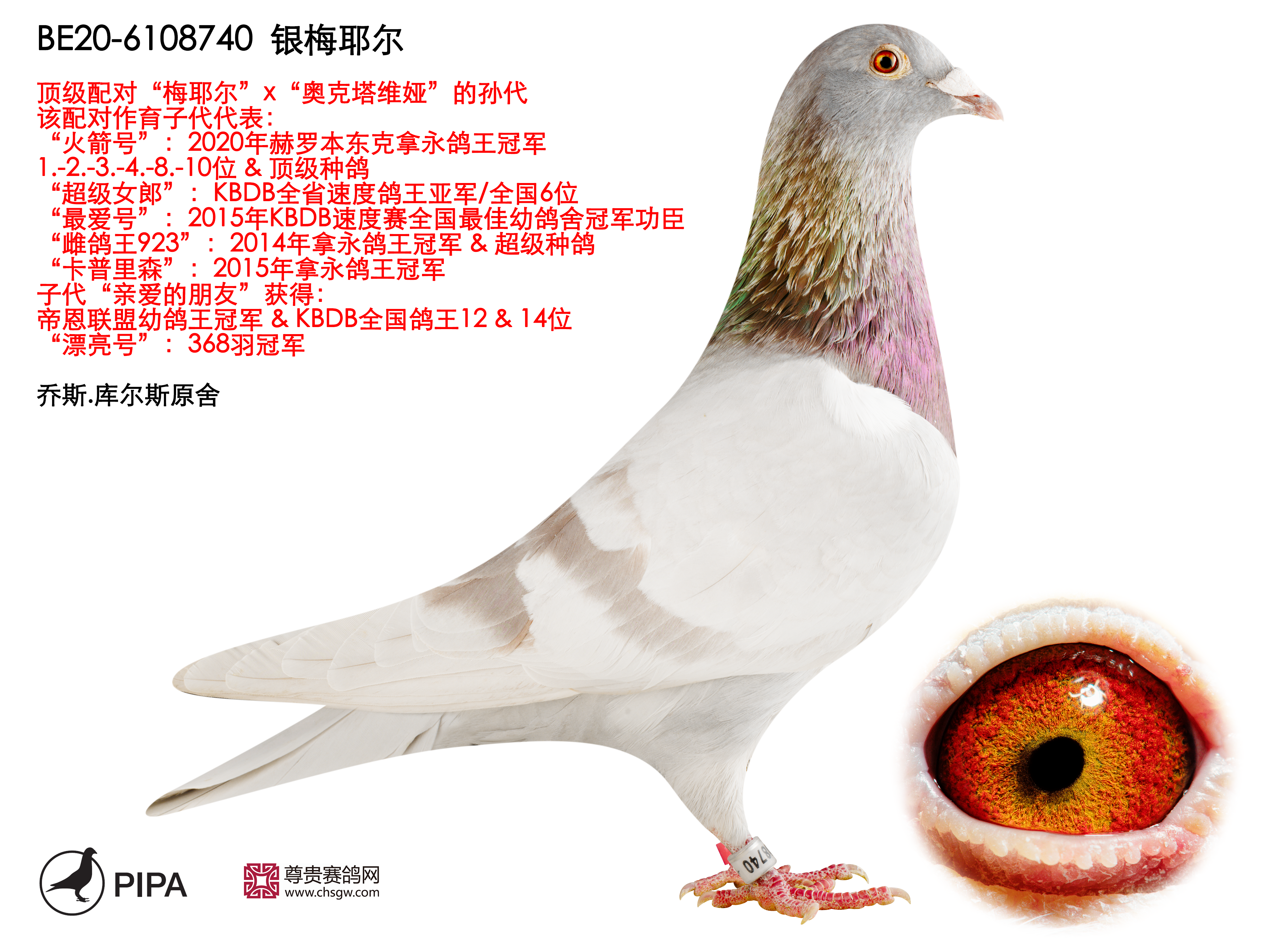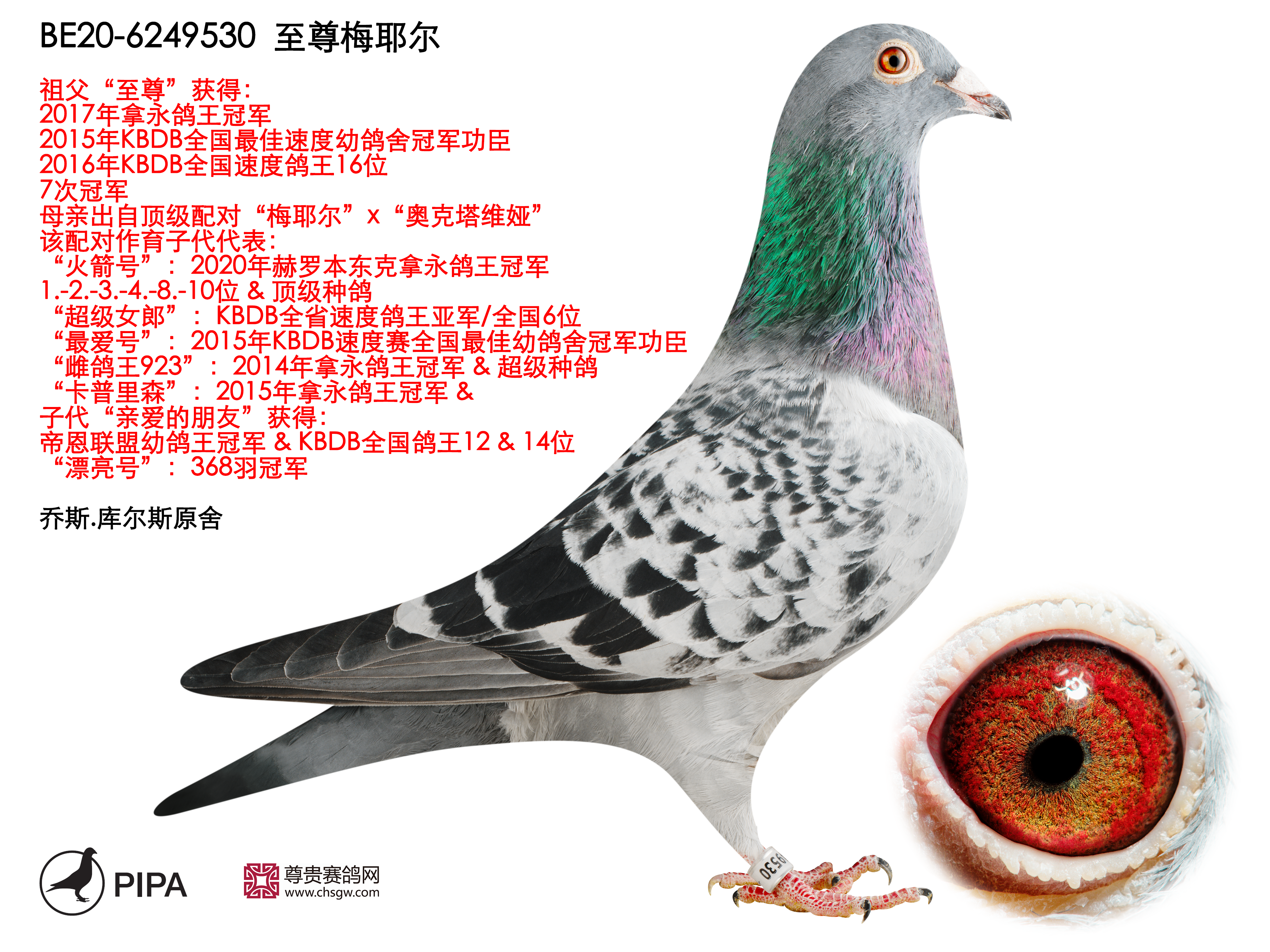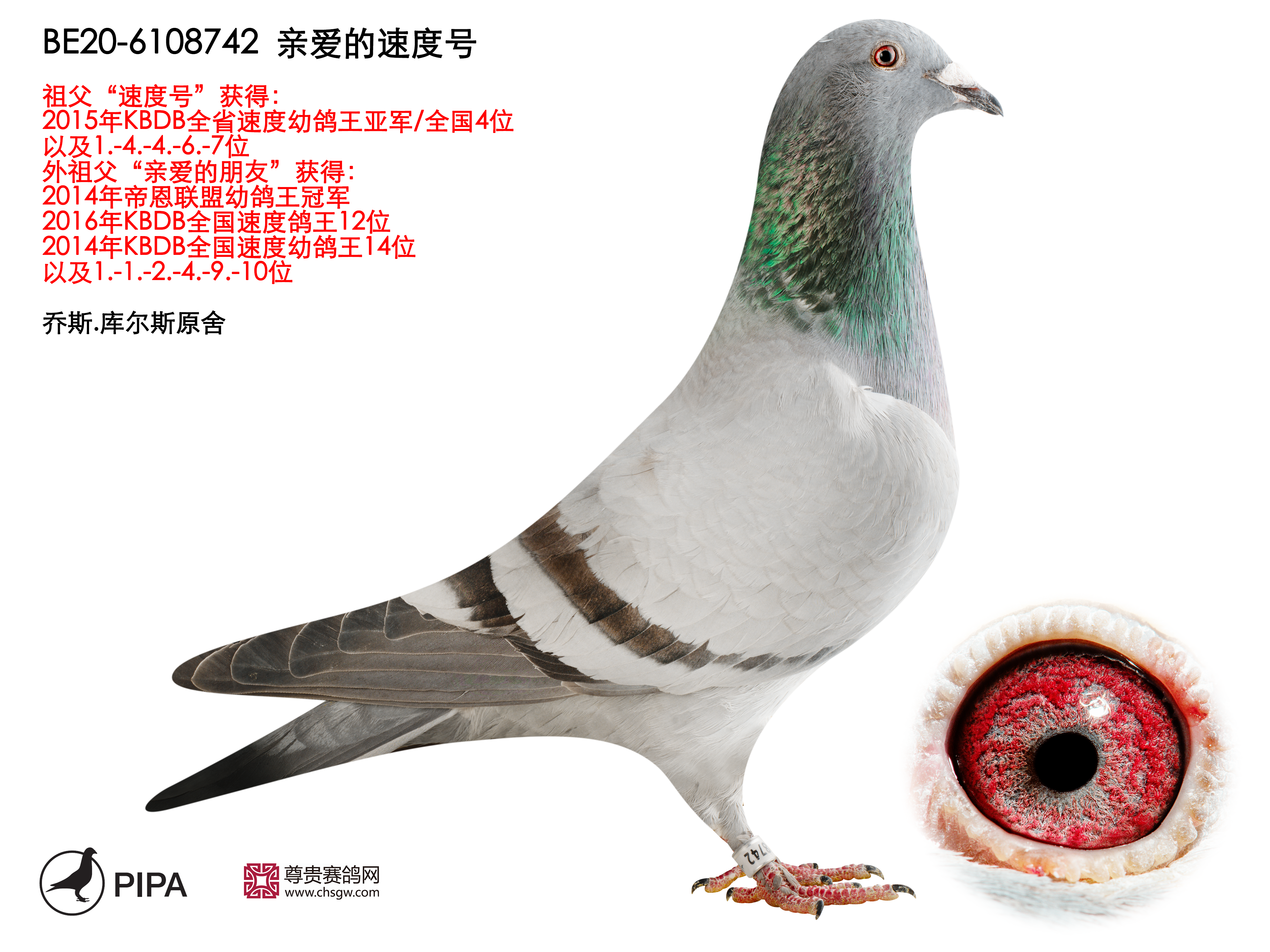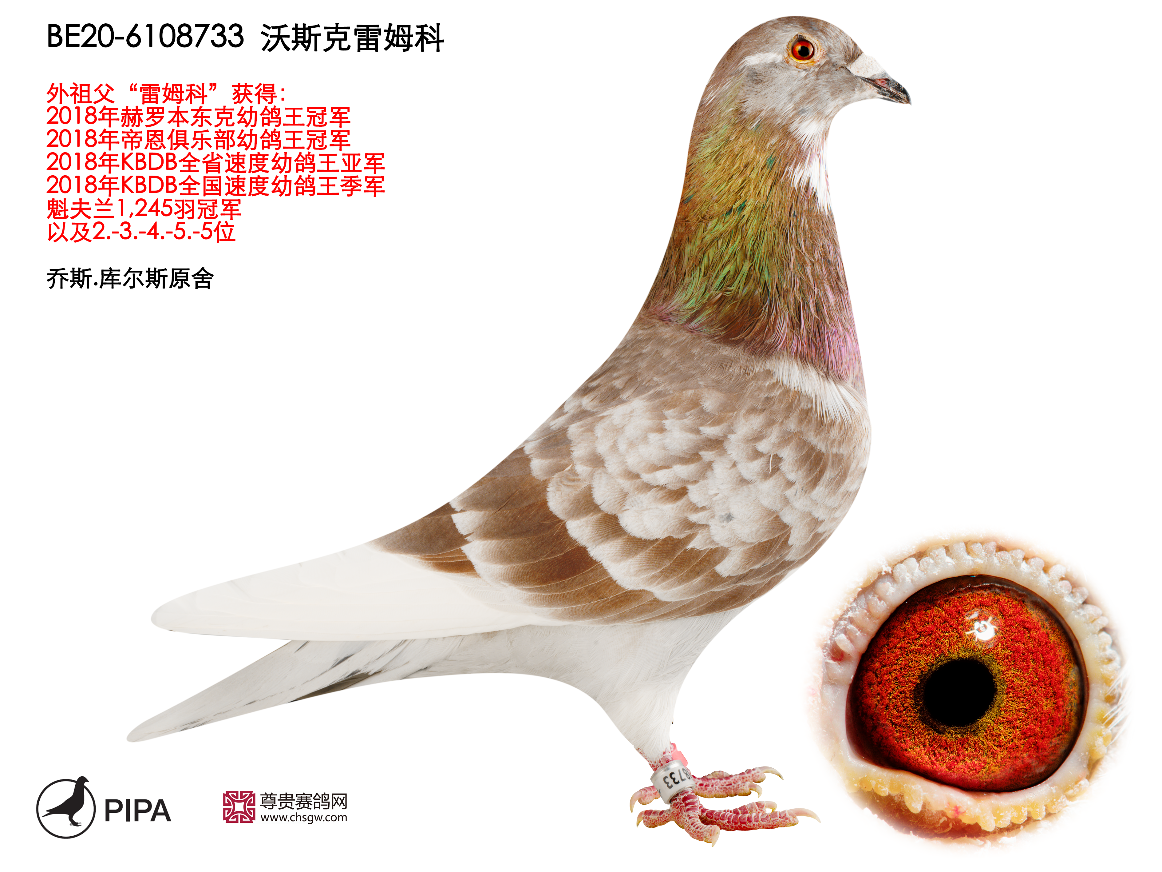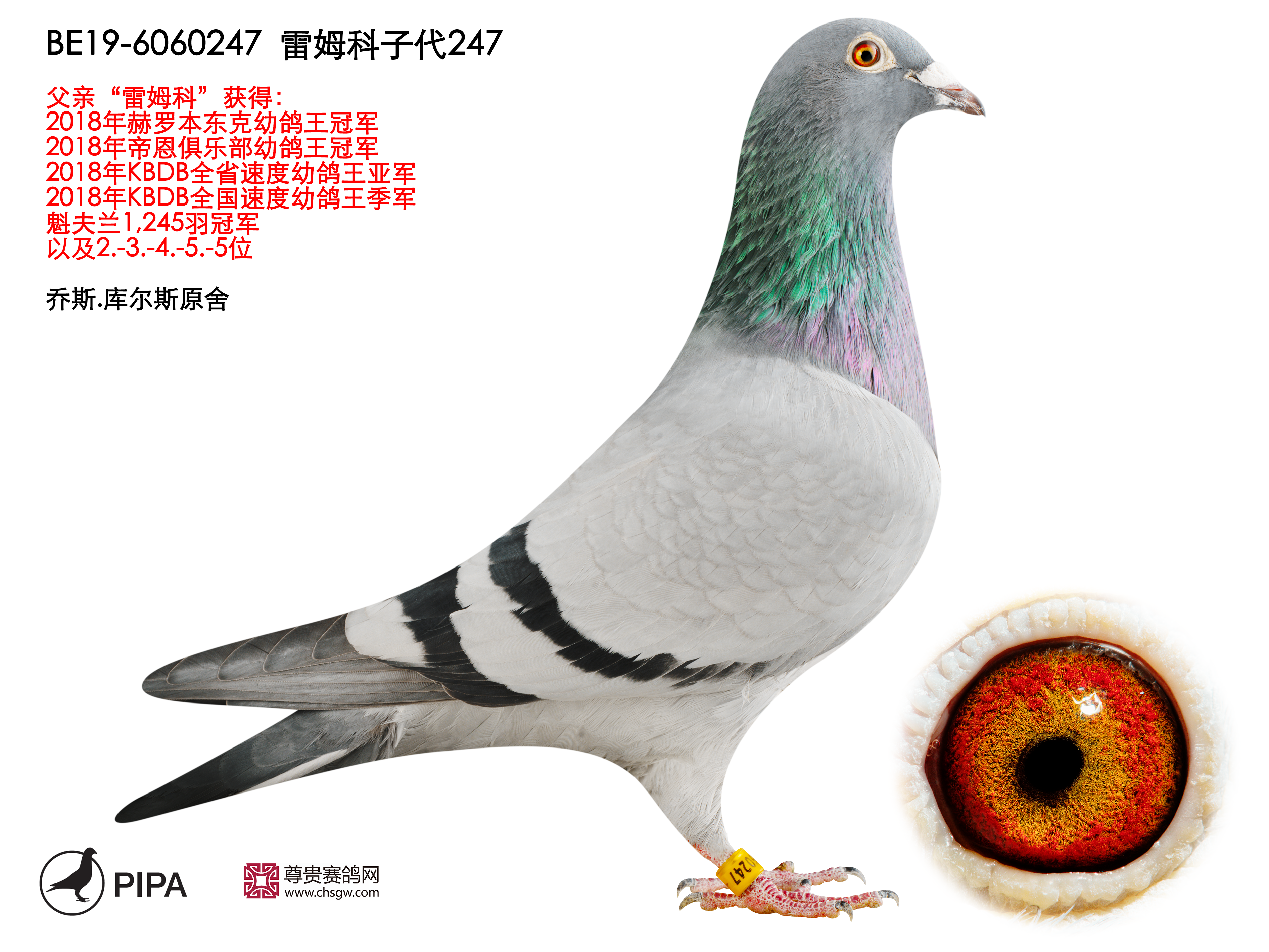 乔斯·库尔斯赛绩彪炳,不仅与各大鸽舍合作作育,还与PIPA合作拍卖舍内优秀赛鸽。最近尊贵赛鸽xPIPA最新上线【比利时速度之王——乔斯·库尔斯】拍卖会,10月20号晚8点尊贵拍卖小程序直播截拍。此次拍卖将提供8羽优质种鸽,其中包括2018年KBDB全省速度幼鸽王亚军“雷姆科”直子、2015年KBDB全省速度幼鸽王亚军“速度号”直孙、2017年拿永鸽王冠军“至尊”孙代等优质赛鸽。