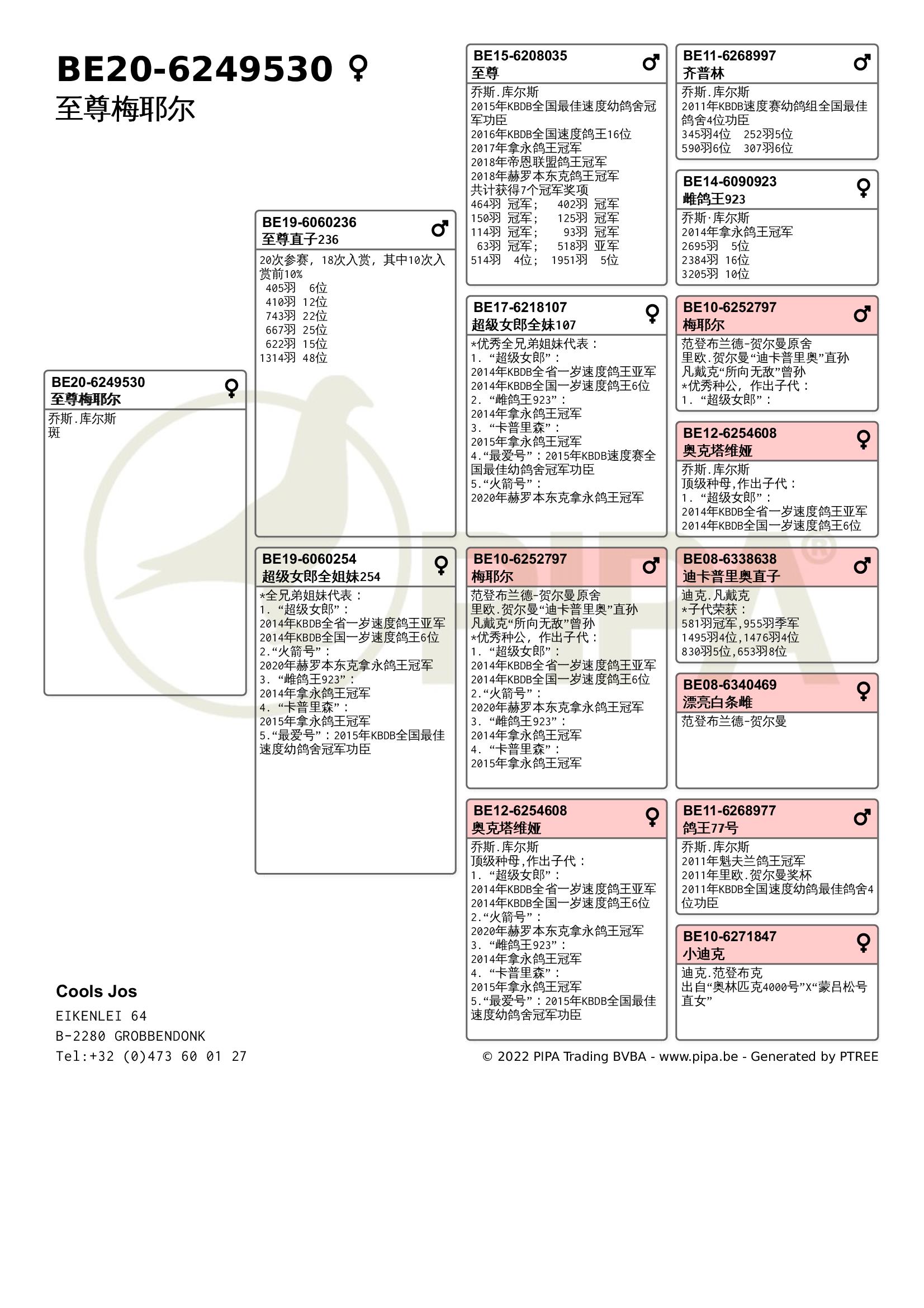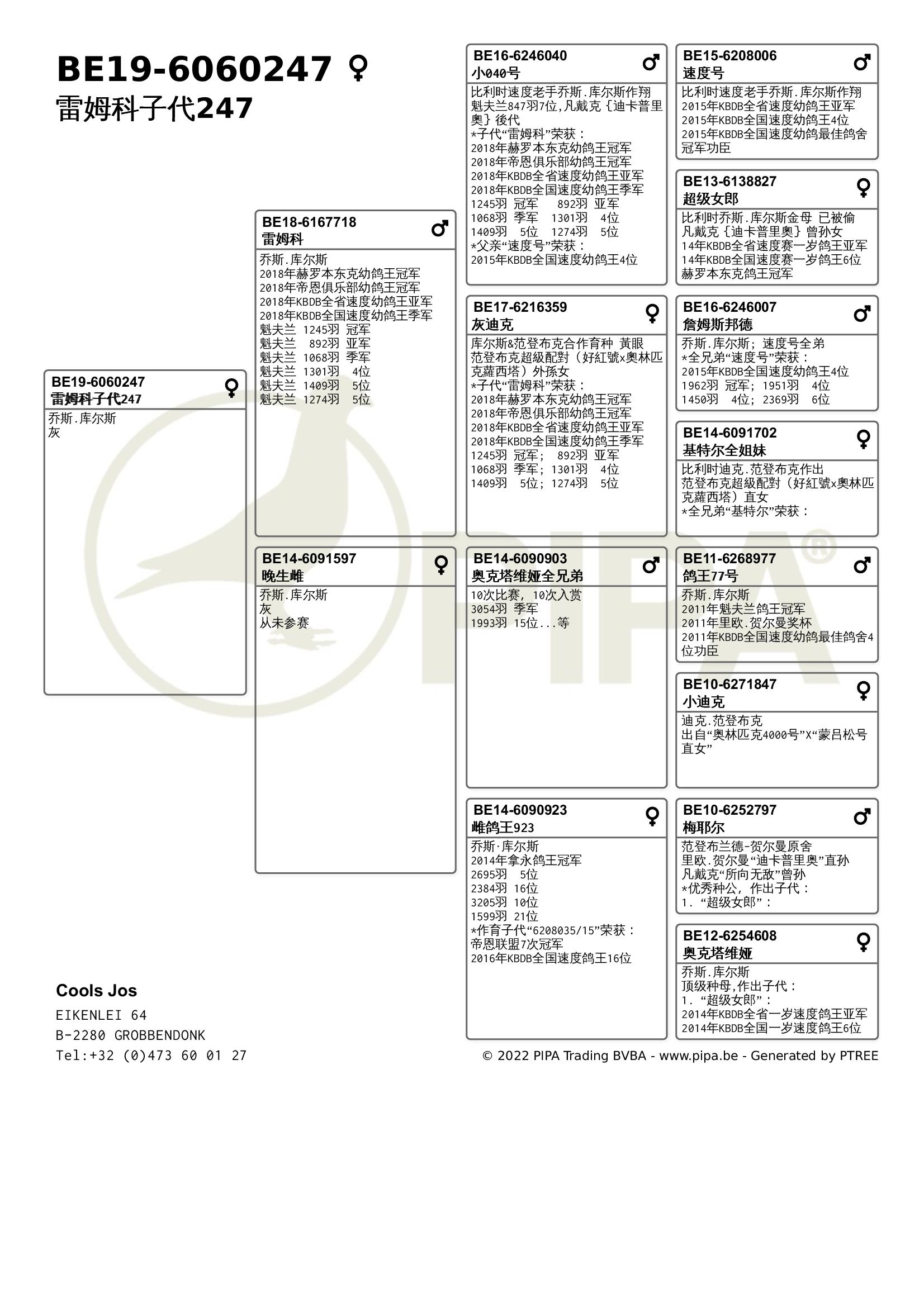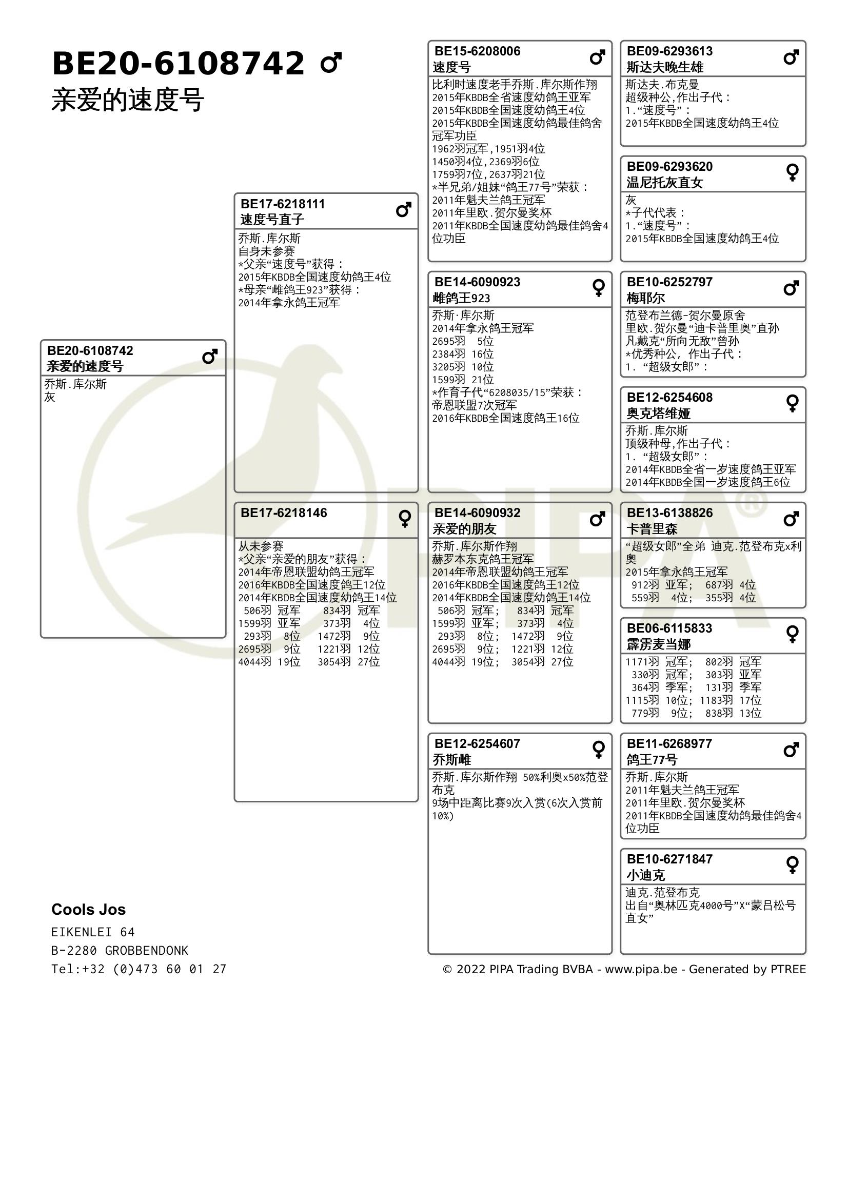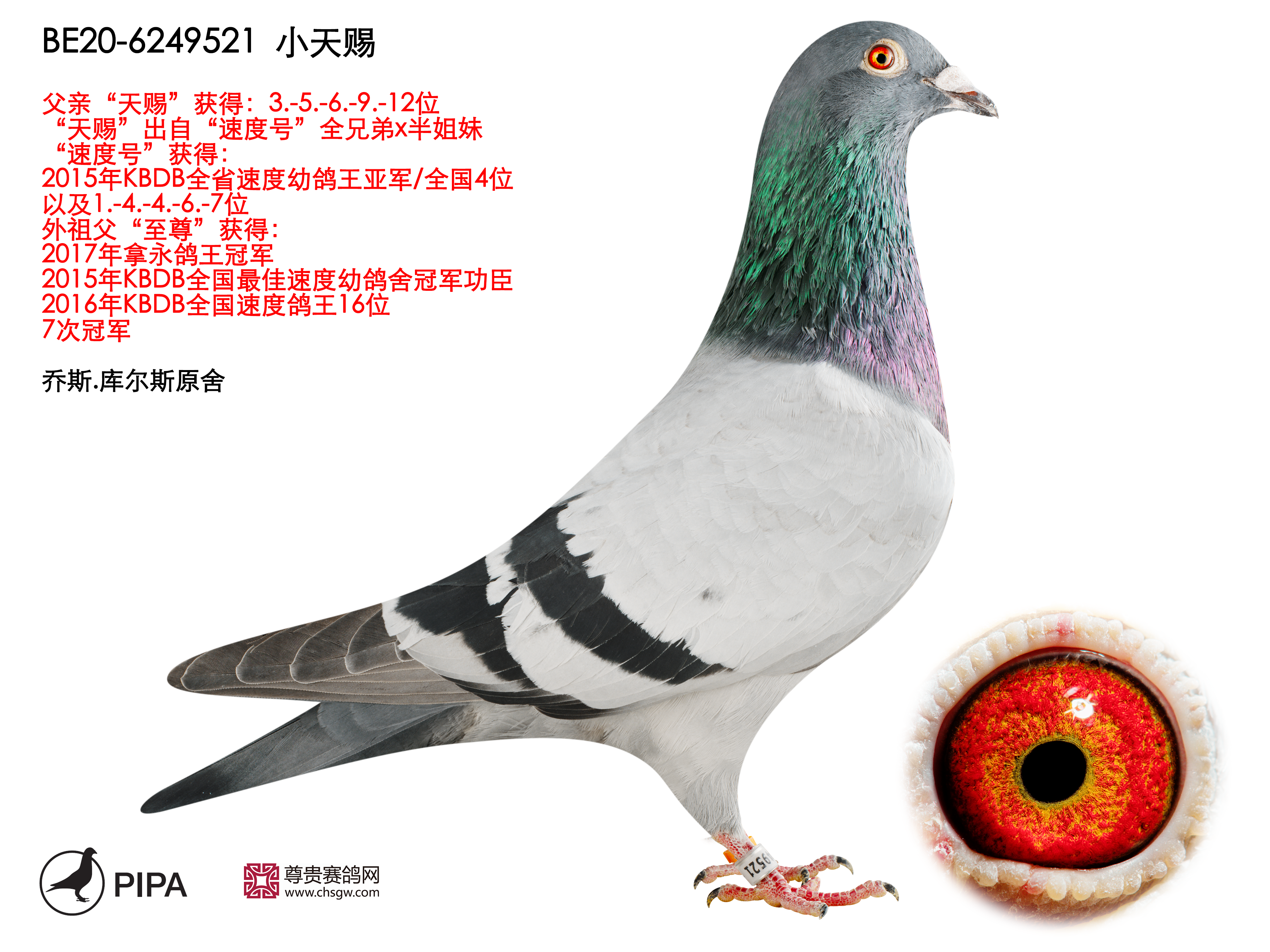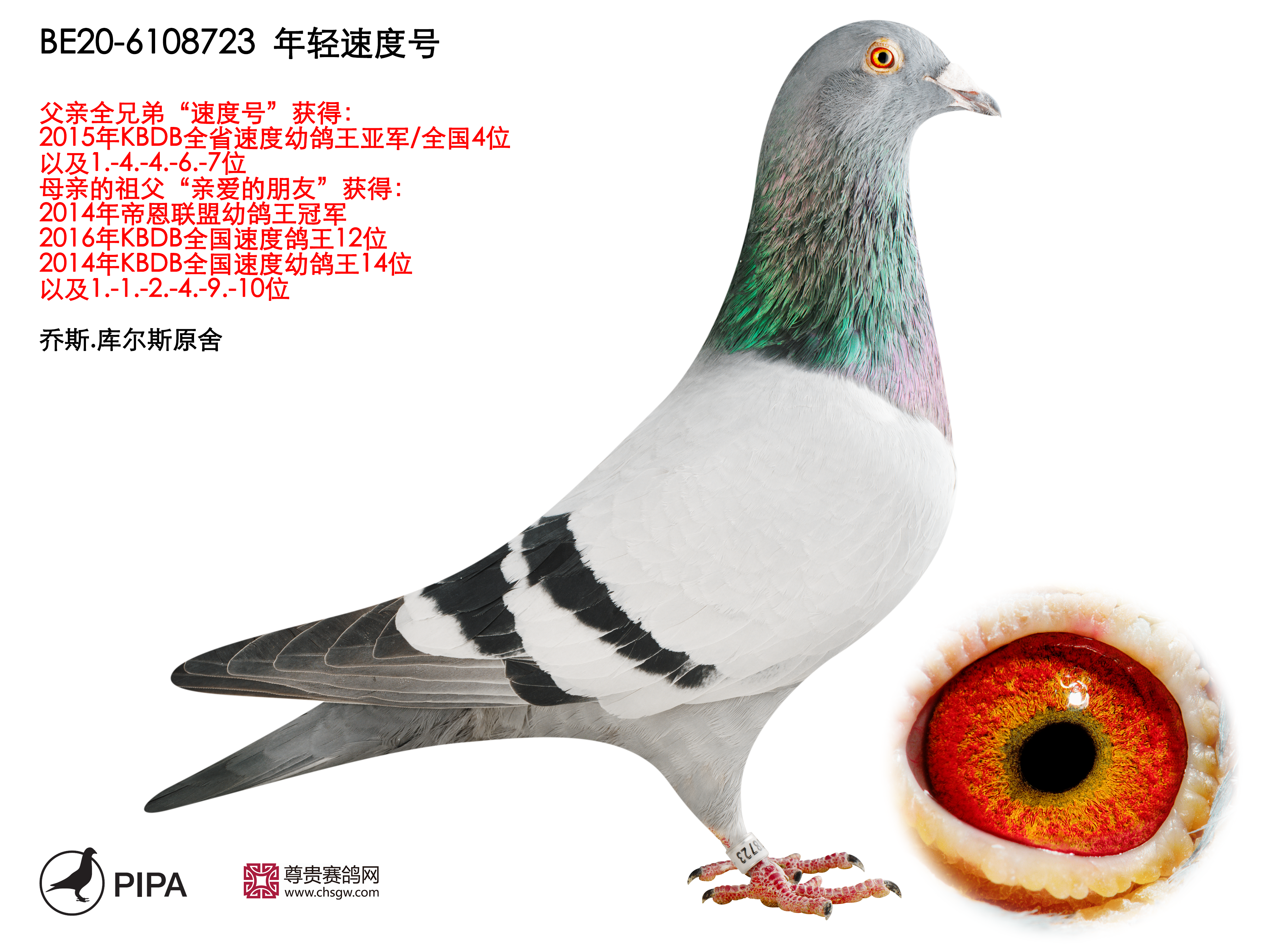 乔斯·库尔斯赛绩彪炳,不仅与各大鸽舍合作作育,还与PIPA合作拍卖舍内优秀赛鸽。最近尊贵赛鸽xPIPA最新上线【比利时速度之王——乔斯·库尔斯】拍卖会,10月20号晚8点尊贵拍卖小程序直播截拍。此次拍卖将提供8羽优质种鸽,其中包括2018年KBDB全省速度幼鸽王亚军“雷姆科”直子、2015年KBDB全省速度幼鸽王亚军“速度号”直孙、2017年拿永鸽王冠军“至尊”孙代等优质赛鸽。