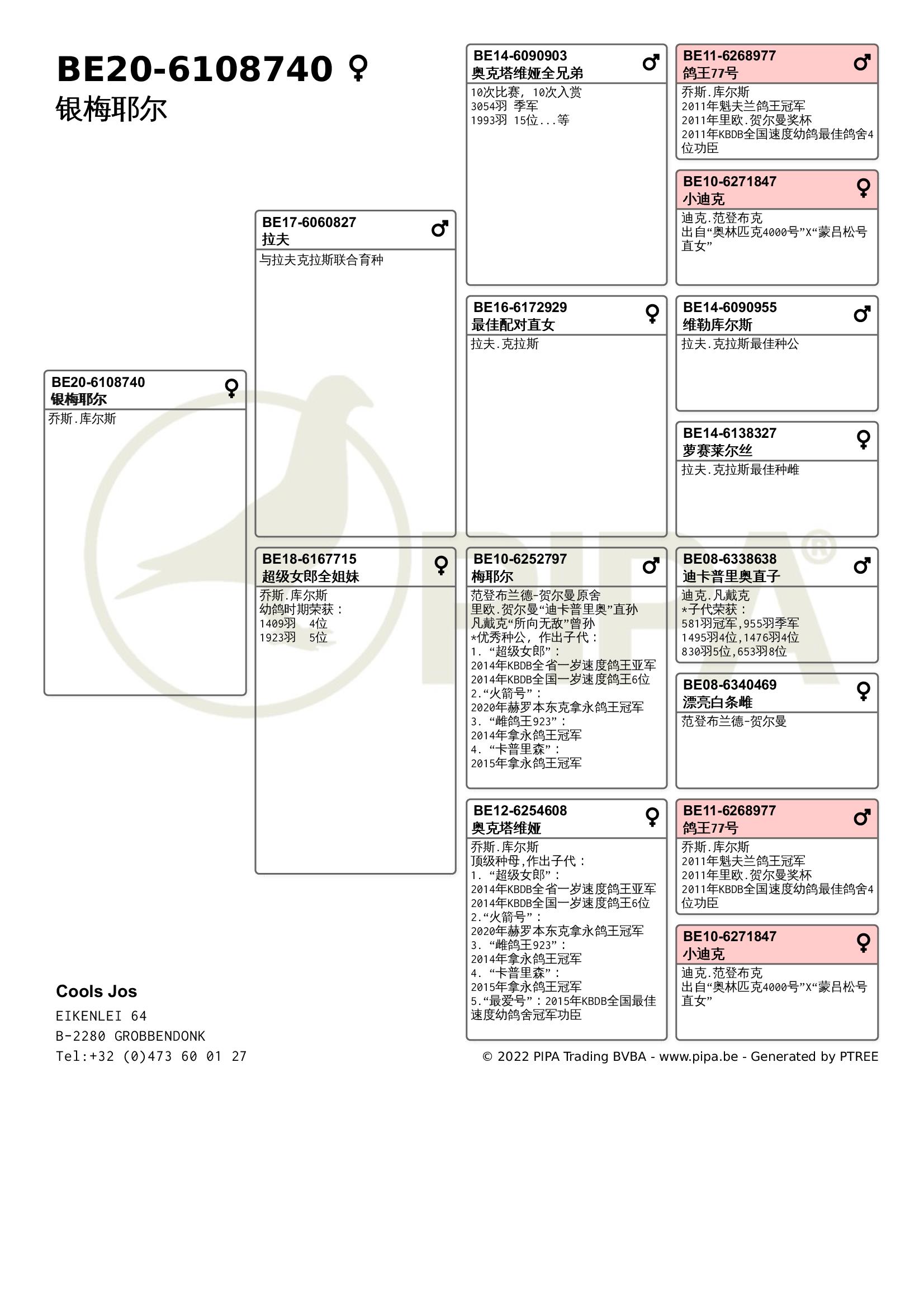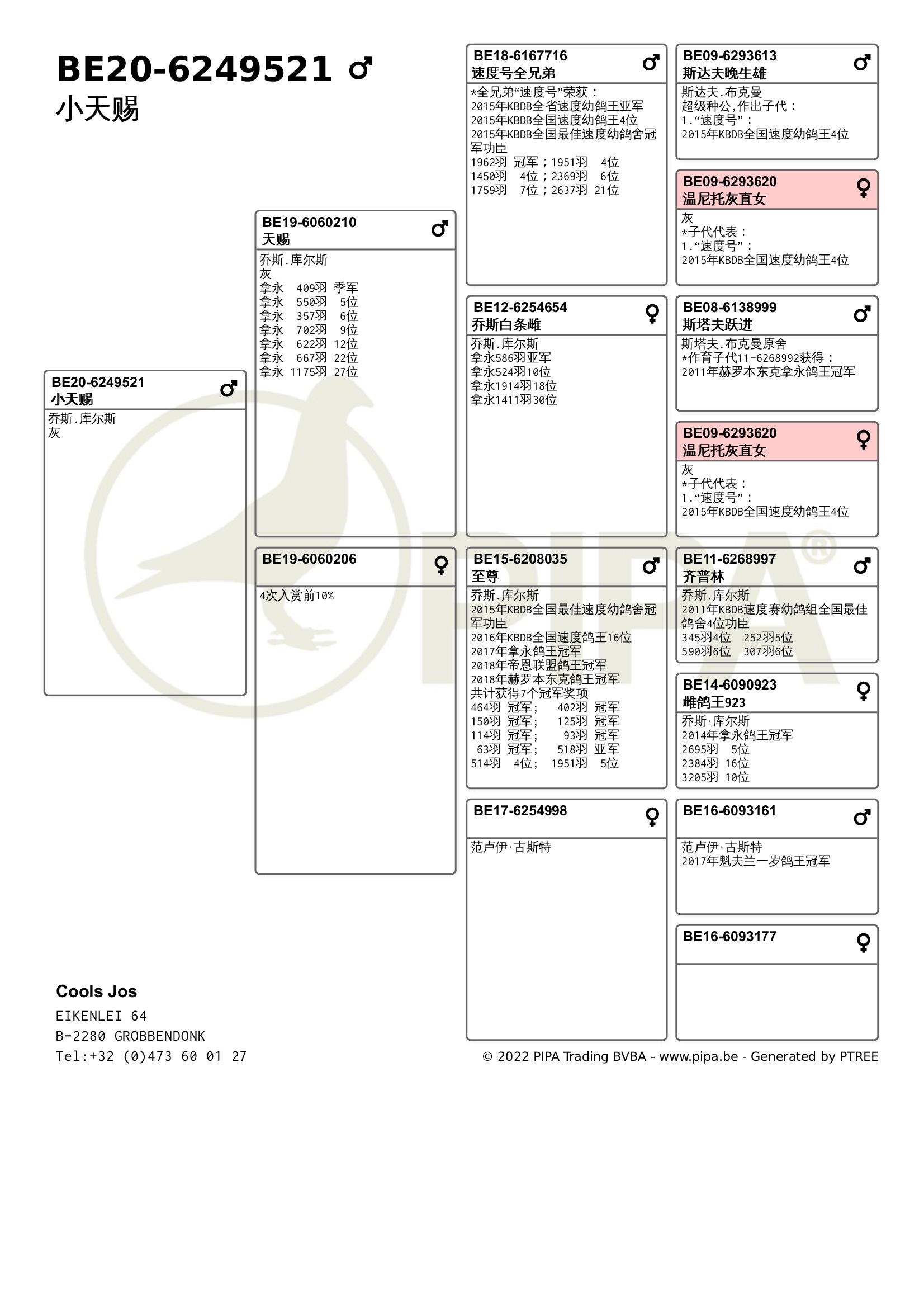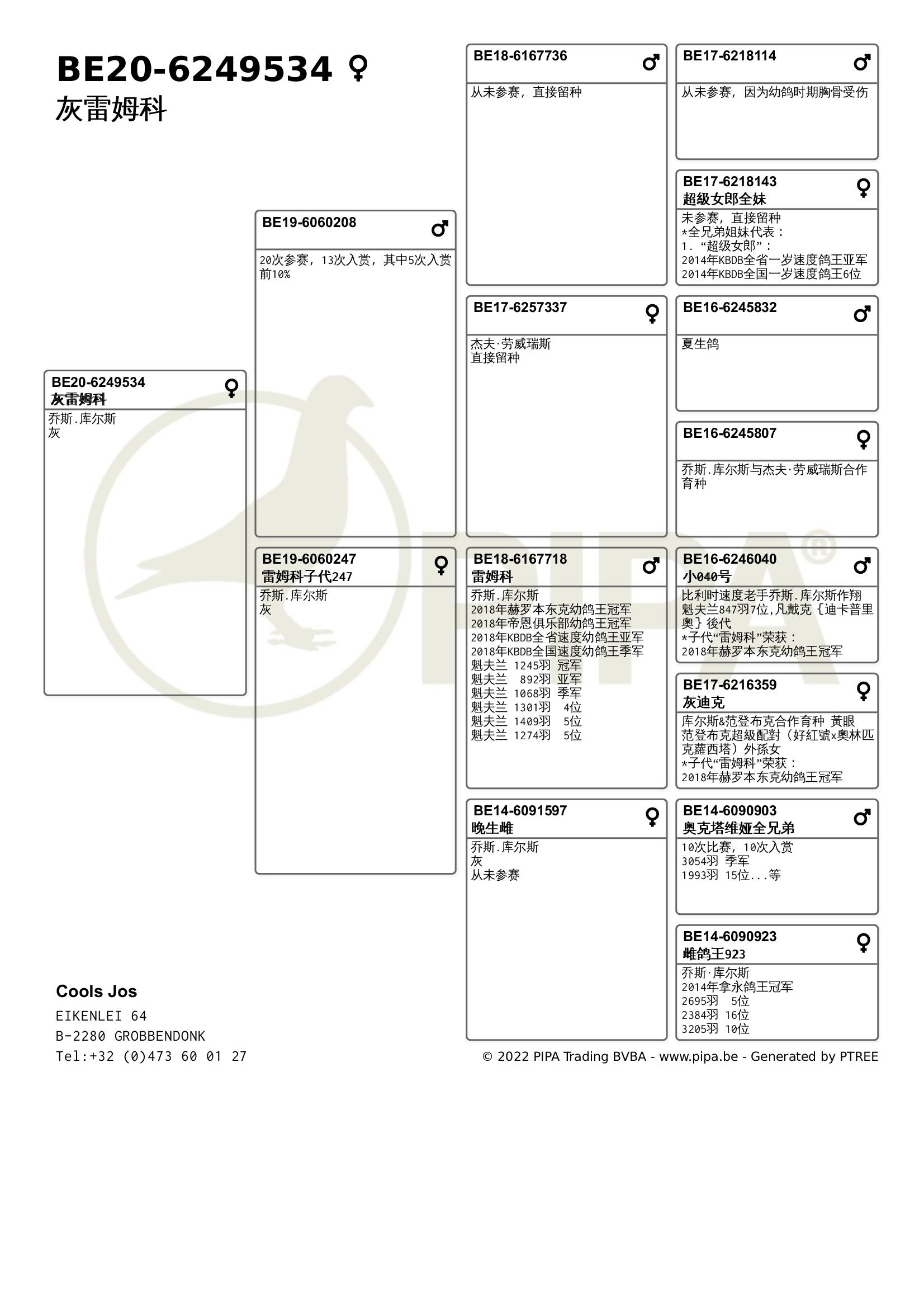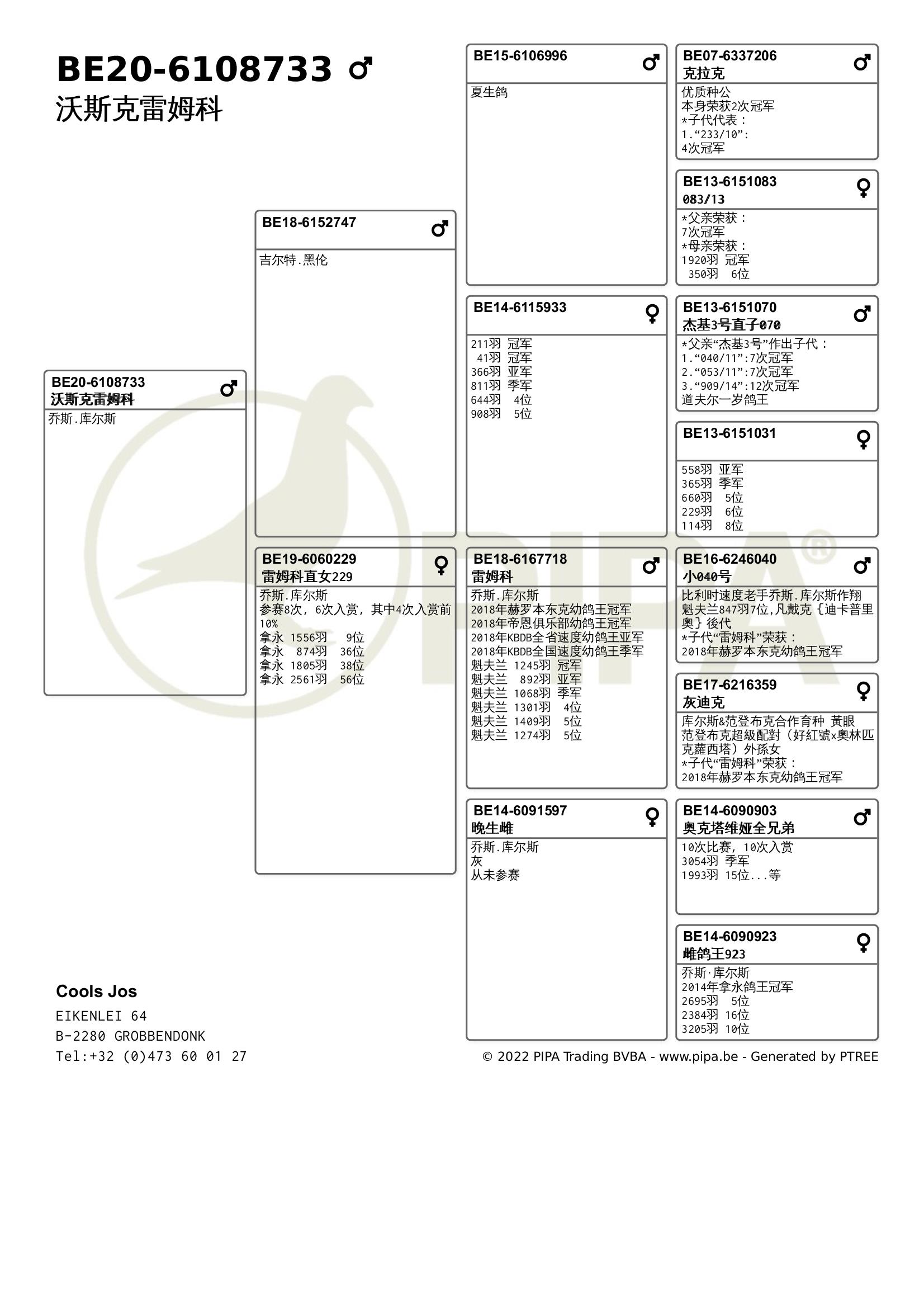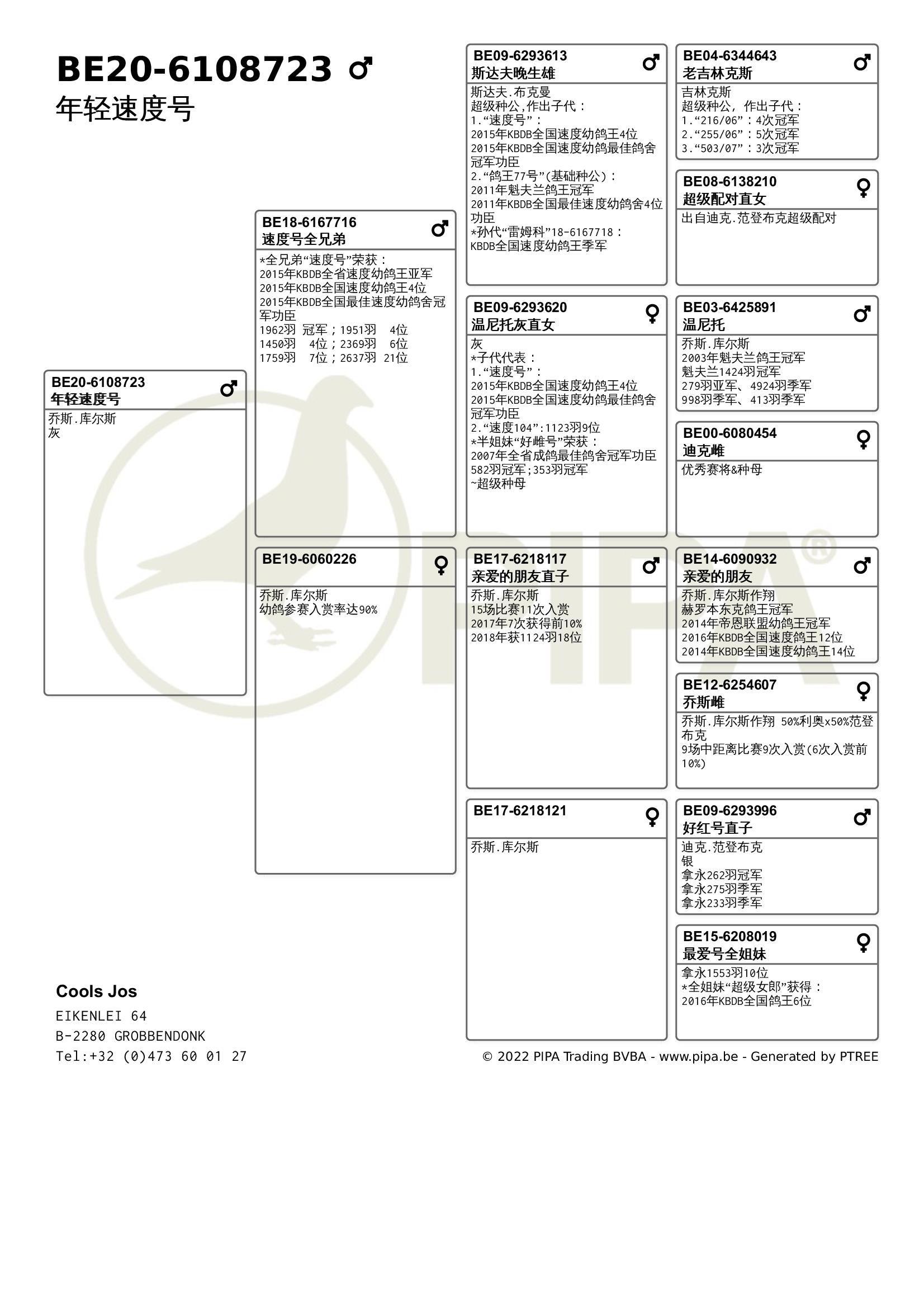 乔斯·库尔斯赛绩彪炳,不仅与各大鸽舍合作作育,还与PIPA合作拍卖舍内优秀赛鸽。最近尊贵赛鸽xPIPA最新上线【比利时速度之王——乔斯·库尔斯】拍卖会,10月20号晚8点尊贵拍卖小程序直播截拍。此次拍卖将提供8羽优质种鸽,其中包括2018年KBDB全省速度幼鸽王亚军“雷姆科”直子、2015年KBDB全省速度幼鸽王亚军“速度号”直孙、2017年拿永鸽王冠军“至尊”孙代等优质赛鸽。