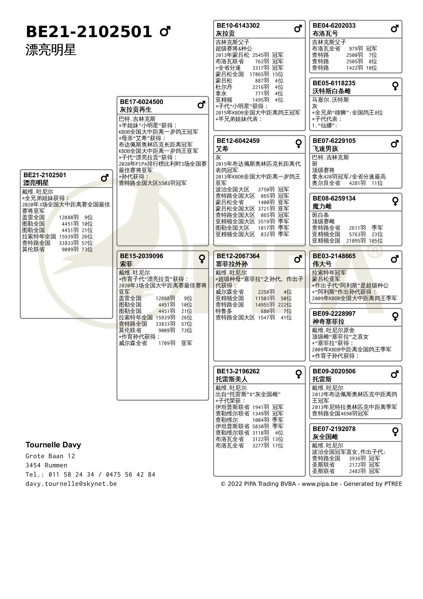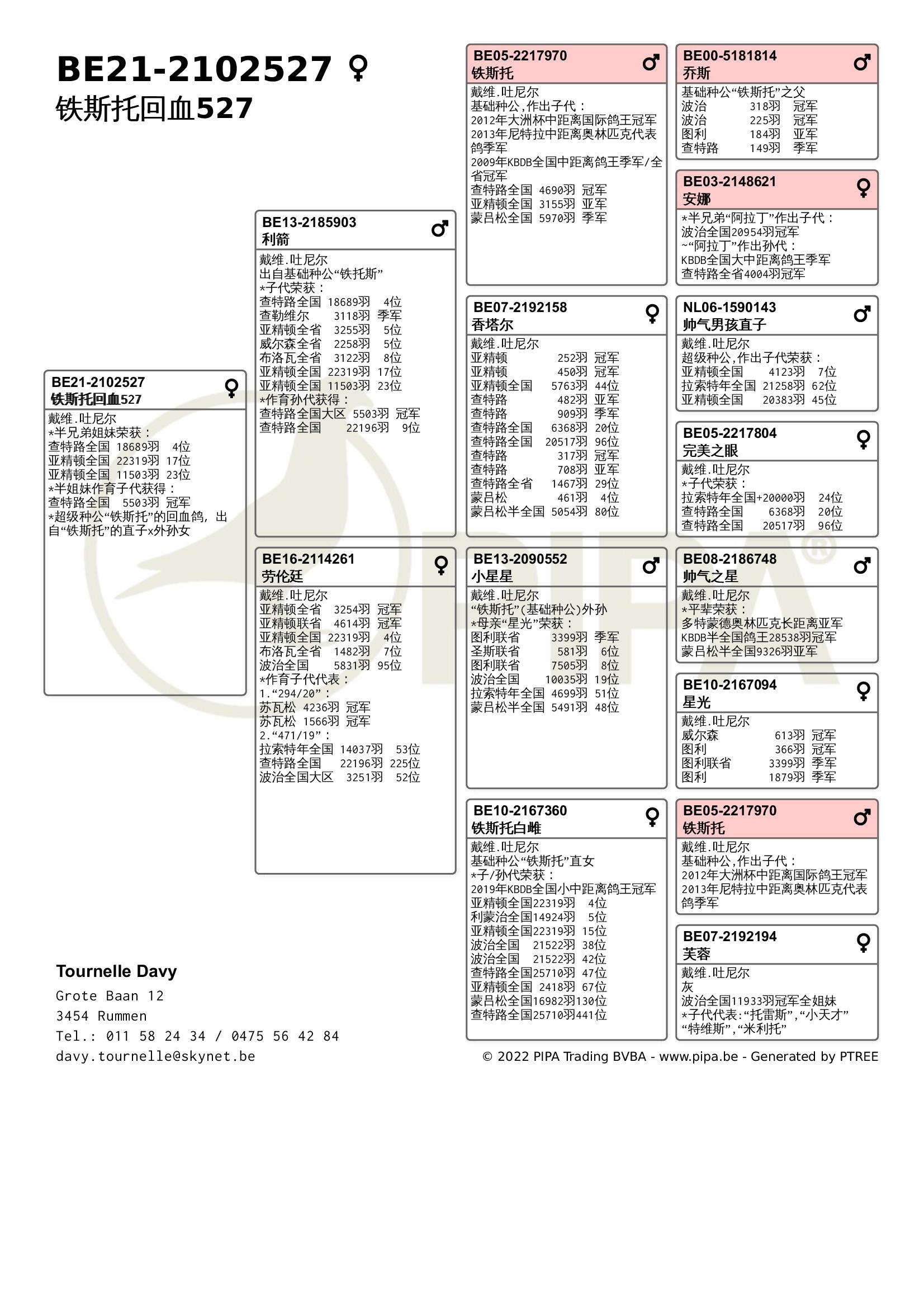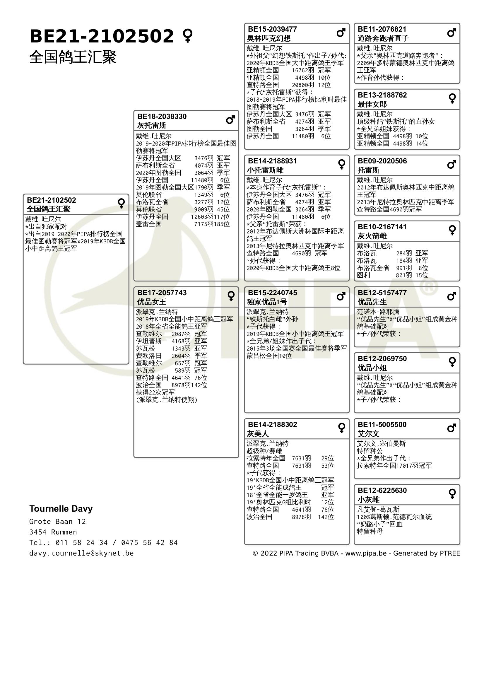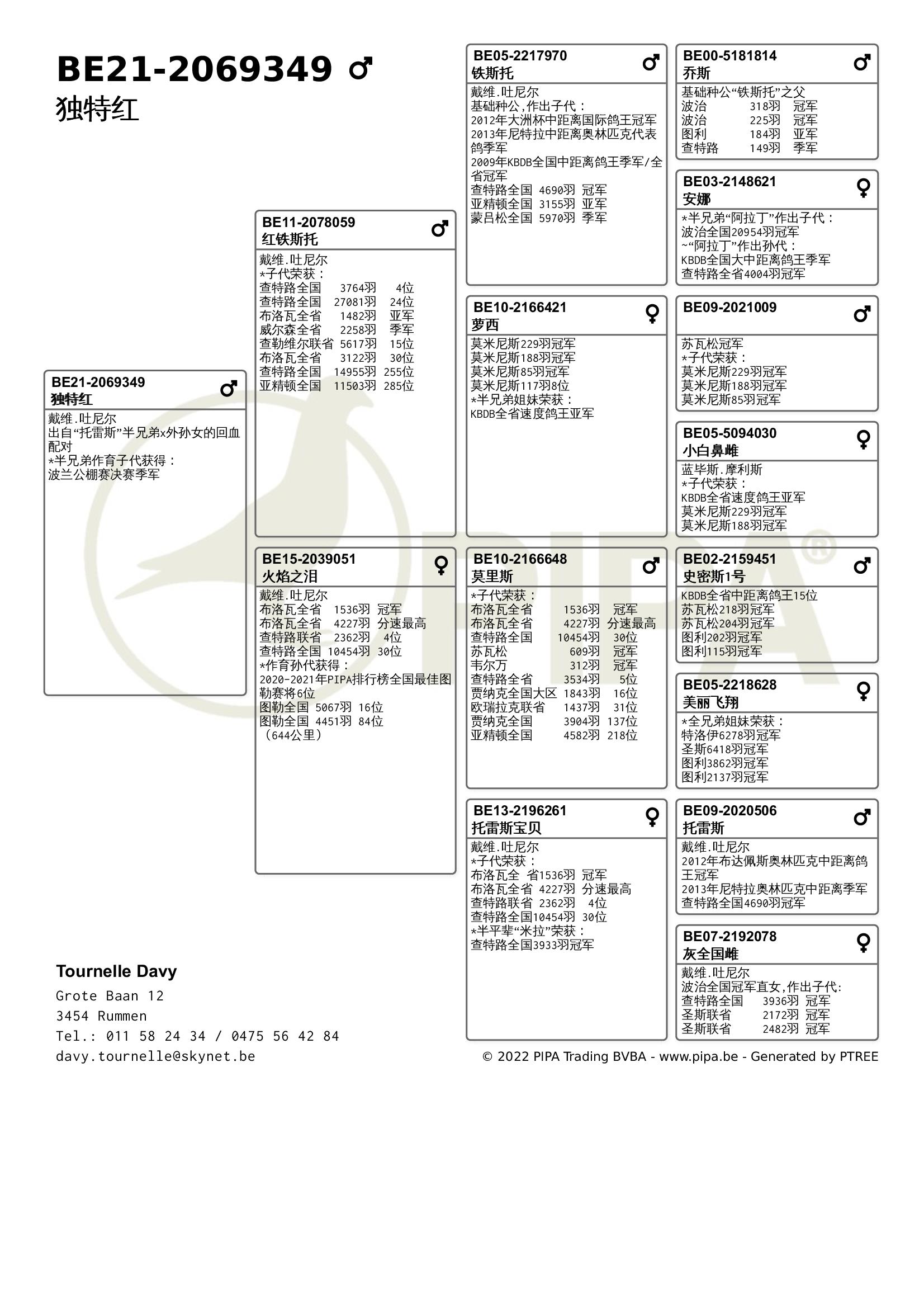 今年戴维.吐尼尔同样表现不俗,在赛季初由于疫情原因赛鸽不允许聚集,因此无法上笼参赛。不论是职业鸽友还是业余鸽友,他们都无不感到失望。经过4周的休赛后,戴维.吐尼尔以洛利斯联省赛冠军取得开门红,“漂亮公主”(BE20-2060553)战胜了2478羽成鸽夺冠,这羽雌鸽也在查特路全国赛进入全国前100位。2021年它获得KBDB全国大中距离鸽王5位,毫无疑问它出自吐尼尔最佳血系——“铁斯托”血系。