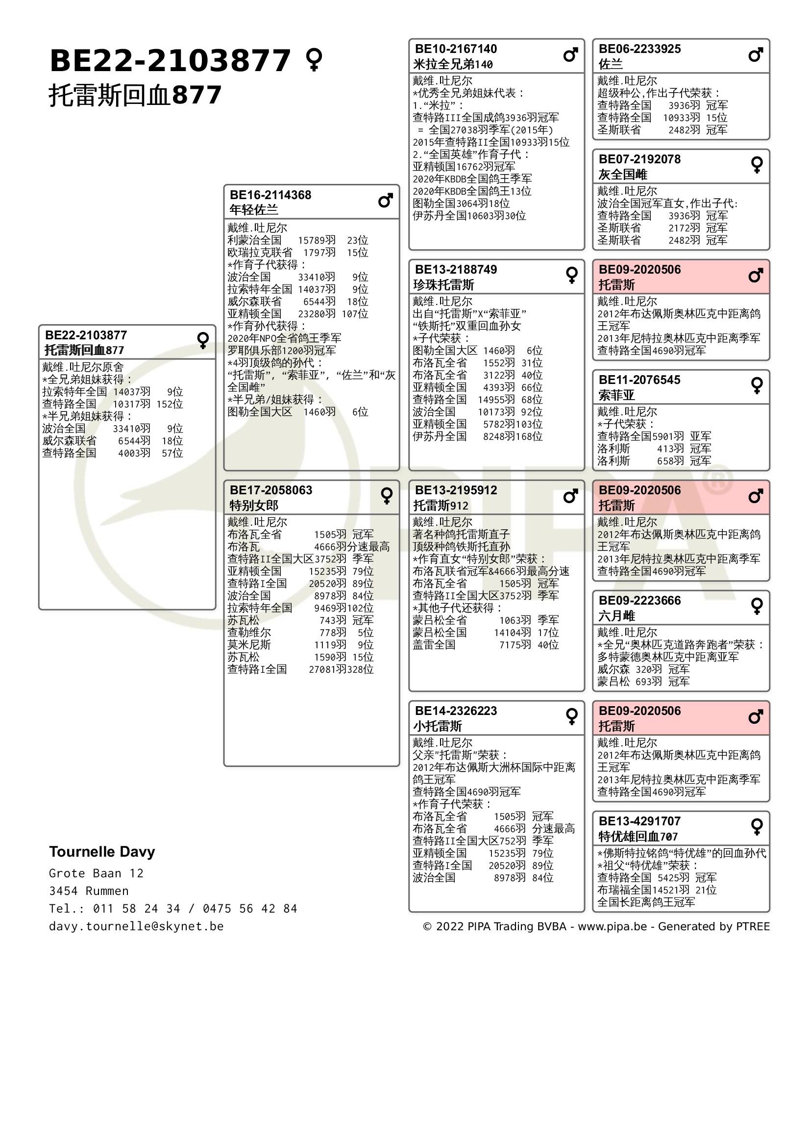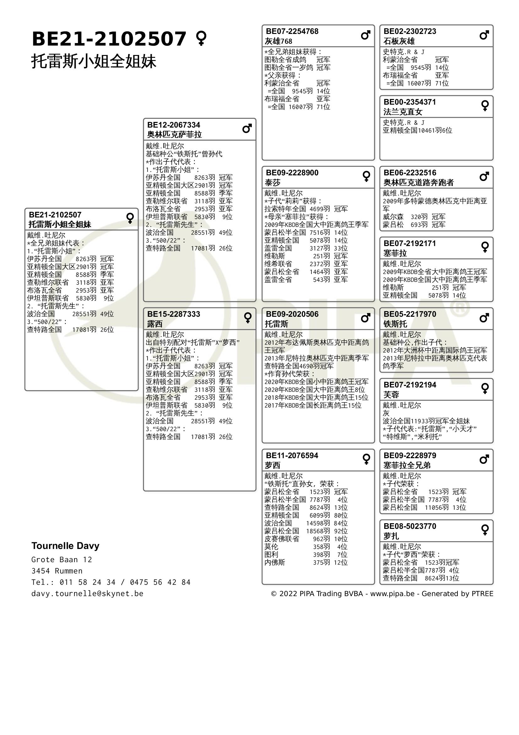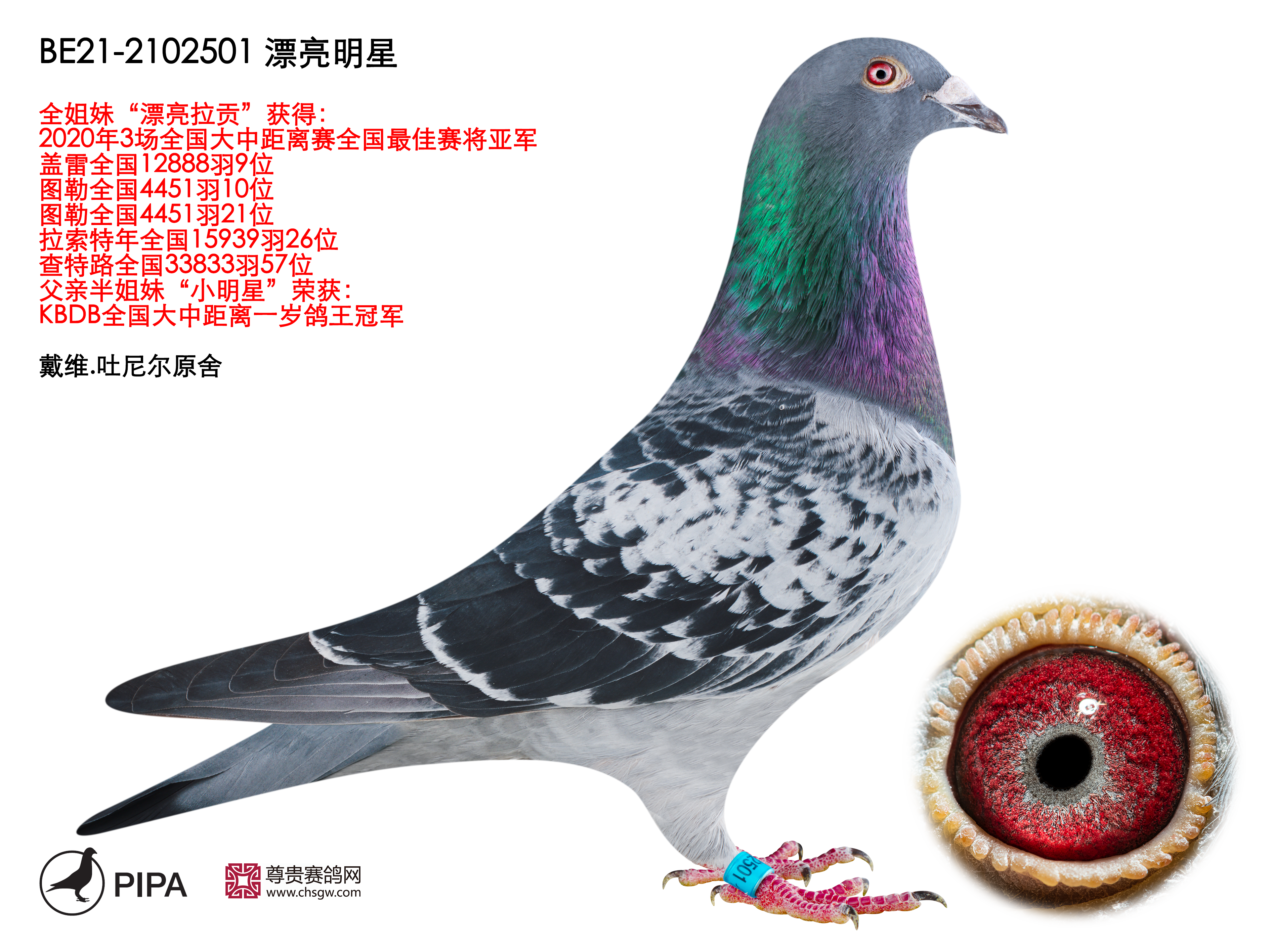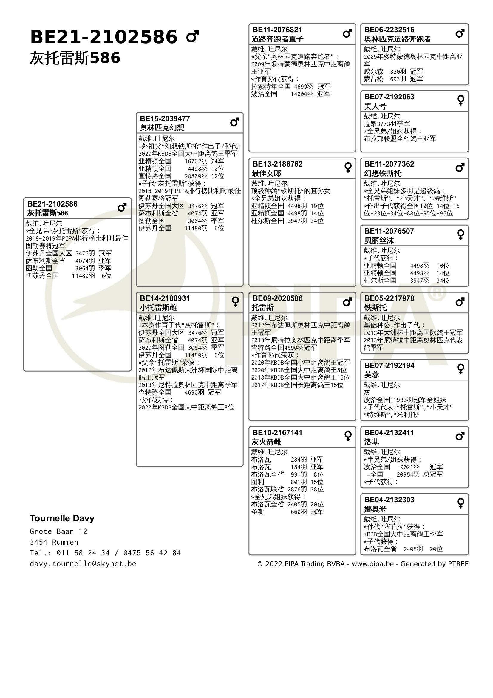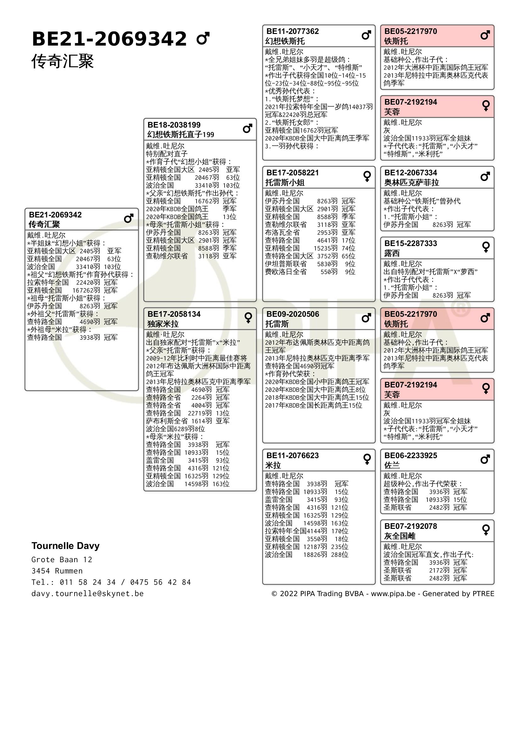 今年戴维.吐尼尔同样表现不俗,在赛季初由于疫情原因赛鸽不允许聚集,因此无法上笼参赛。不论是职业鸽友还是业余鸽友,他们都无不感到失望。经过4周的休赛后,戴维.吐尼尔以洛利斯联省赛冠军取得开门红,“漂亮公主”(BE20-2060553)战胜了2478羽成鸽夺冠,这羽雌鸽也在查特路全国赛进入全国前100位。2021年它获得KBDB全国大中距离鸽王5位,毫无疑问它出自吐尼尔最佳血系——“铁斯托”血系。