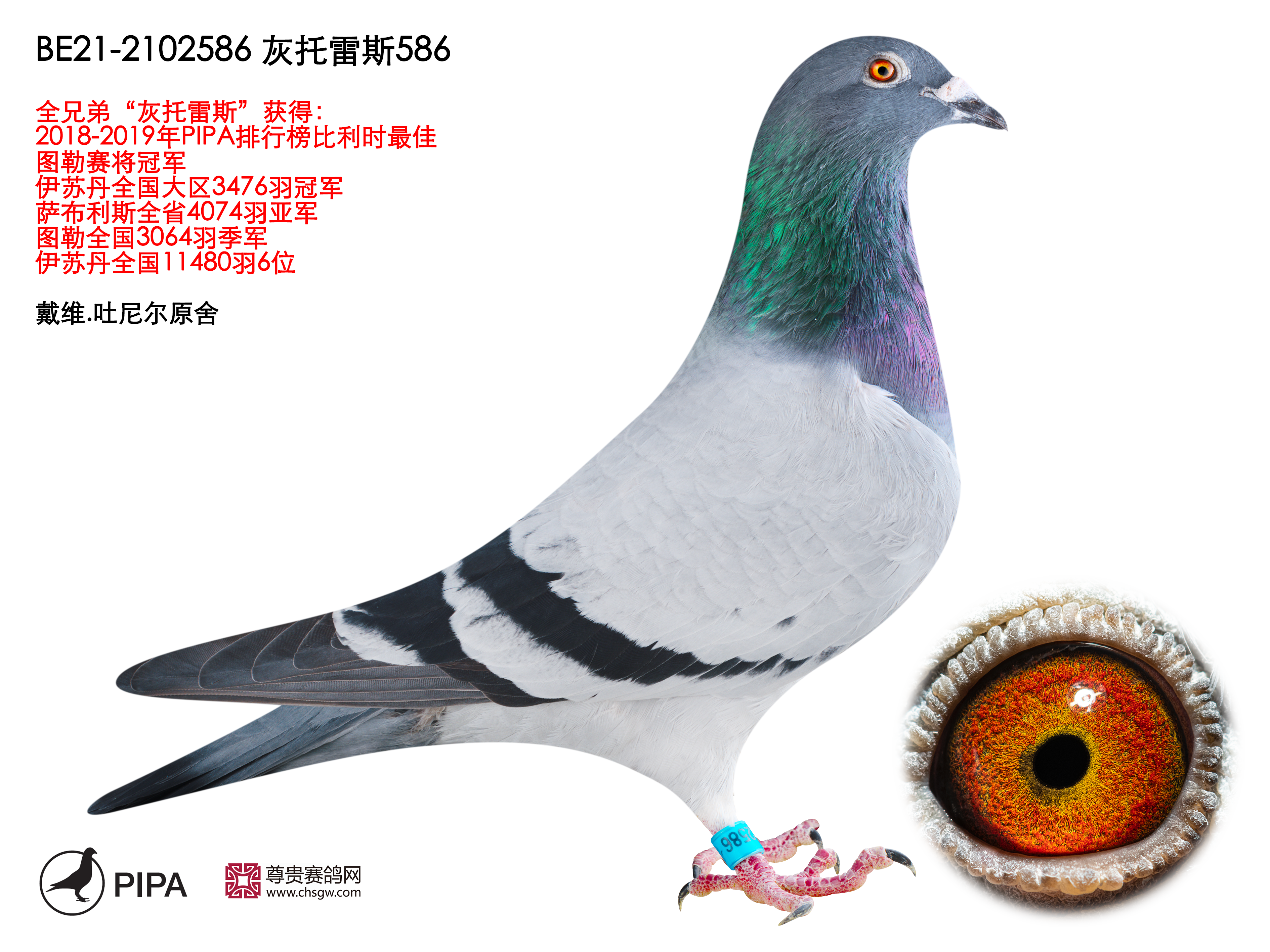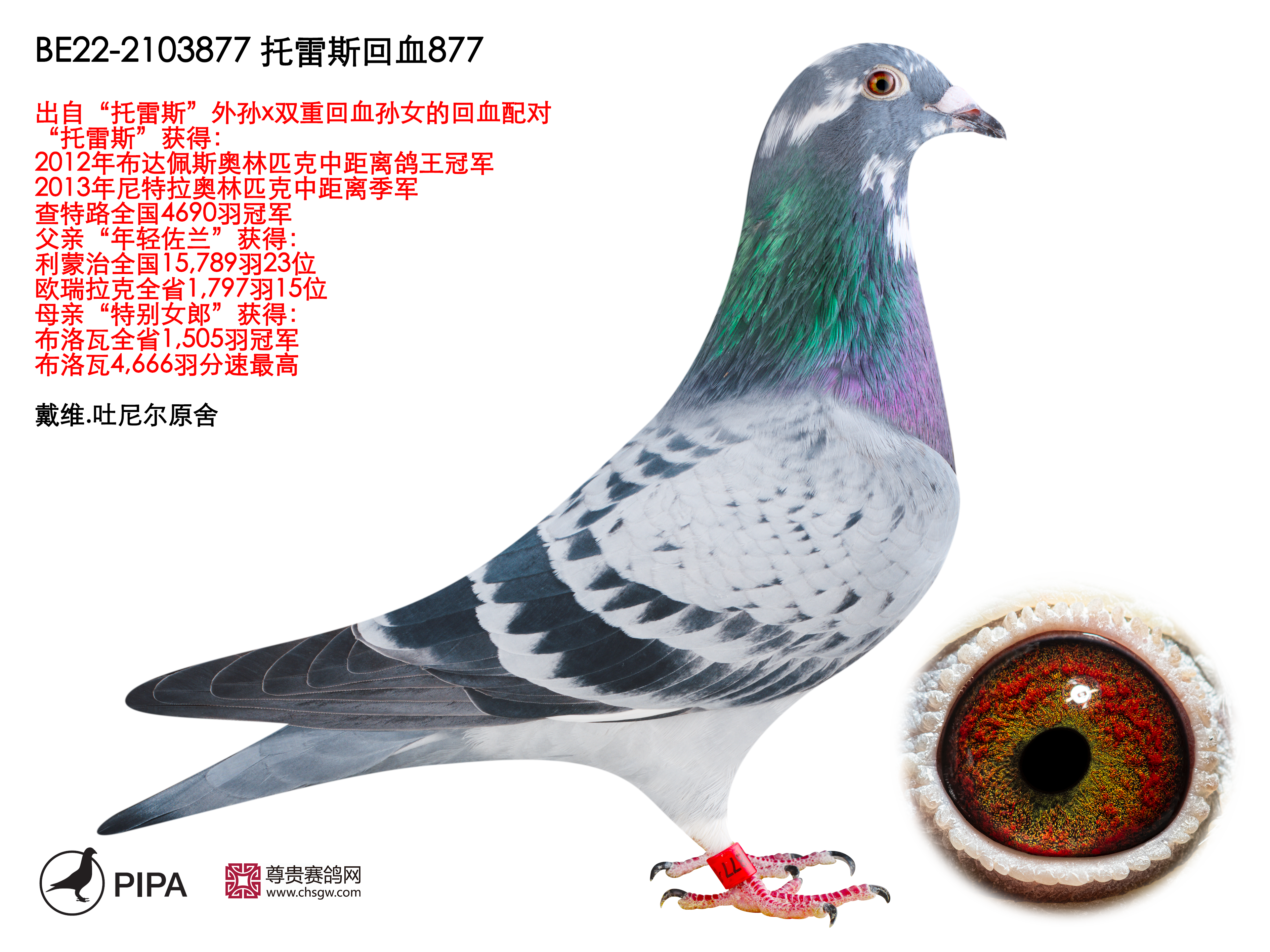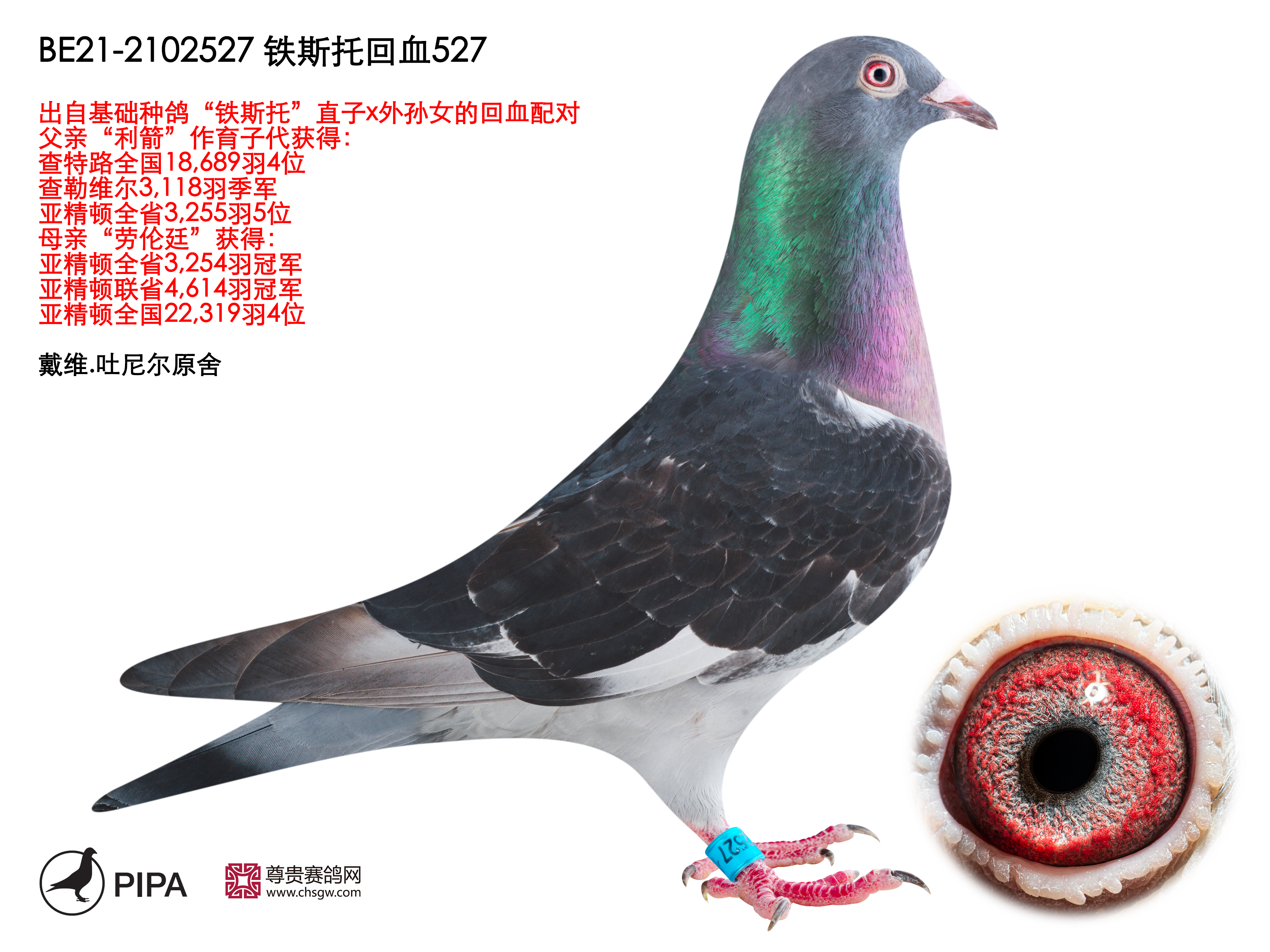 近几年赛季“铁斯托”鸽系更是好评如潮,受到众多鸽友的喜爱。超级种鸽”铁斯托”虽然现在已经无法作育后代,但他的育种成就依然值得关注。他的3代后代已经作育8羽全国冠军、9羽鸽王、21项全国前10位、43项全国前20位、62项前50位。
