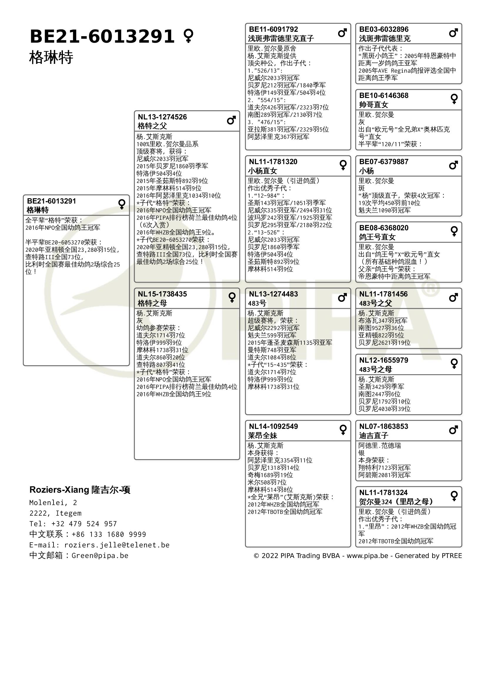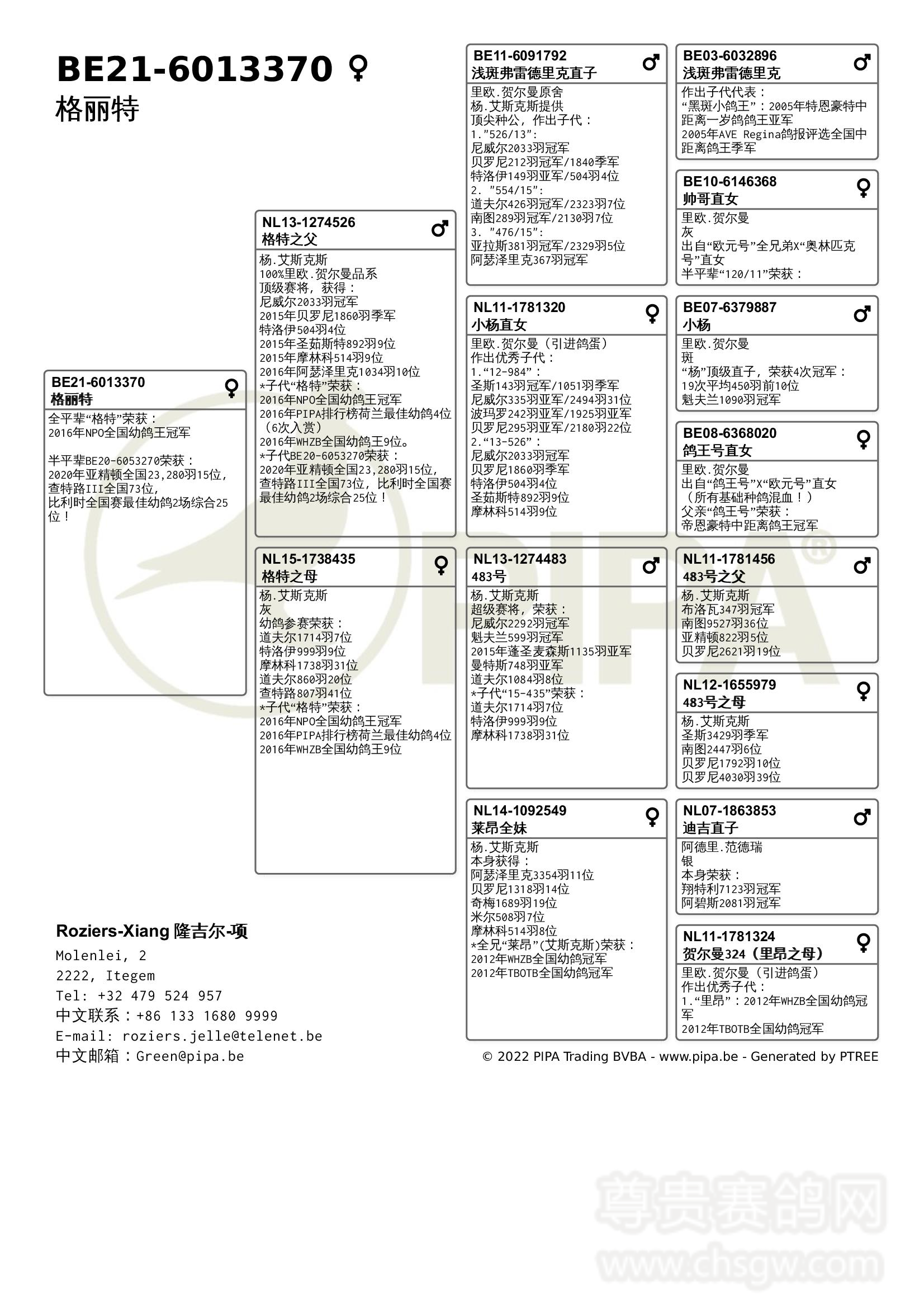 此次鸽海集珍拍卖会(上半场)共有9羽拍卖鸽,这9羽拍卖鸽大多都出自冠军家族血系,其中包括2016NPO幼鸽鸽王冠军“格特”全平辈“格丽特”和“格琳特”、北京丰台550公里冠军直子、2010年广州浩羽公棚亚运杯决赛亚军“亚运”直子等。值得一提的是,“格丽特”和“格琳特”这两羽种鸽是100%里欧.贺尔曼品系,作为鸽舍最实战的一路鸽子,是鸽舍速度制胜的法宝。