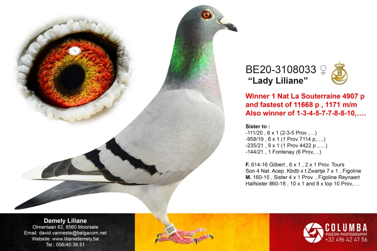 这羽冠军与另外一羽雌鸽配对,她们都在同一个巢箱内产下2枚蛋,1枚蛋被取走,她们两个孵化3枚蛋。这羽漂亮的灰色雌鸽的父亲是著名的“吉伯特”(Gilbert BE16-3039614),这羽种鸽曾获得多项全省冠军,他是德梅利鸽系的明星之一。“丽丽安淑女”的母亲BE15-3145160的全兄姐获得4项全省冠军。