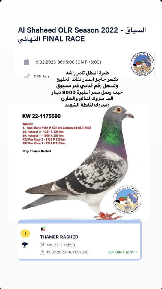 2023年科威特阿尔沙希德公棚525公里决赛冠军是科威特鸽友Thamer Rashed,冠军鸽是一羽雨点雌鸽,环号22-1175590,决赛当天比赛条件非常艰苦,迎来全程的大逆风。冠军鸽领先亚军14分钟归来,获得1501羽冠军!冠军鸽还获得第1场热点赛250公里1968羽99位和第2场热点赛320公里1727羽38位,从而获得鸽王冠军。
