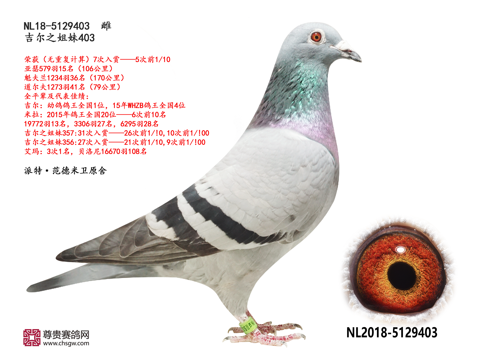 吉尔:幼鸽鸽王全国1位,15年WHZB鸽王全国4位