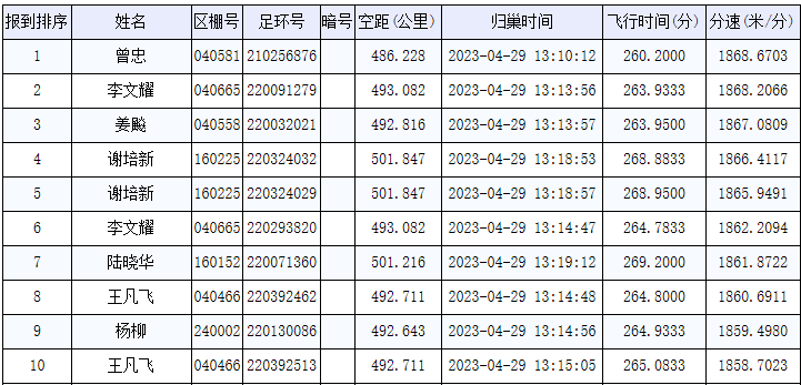 中午13:05:19,首羽赛鸽归巢,是来自朱永军的一羽220130963赛鸽,空距471.397公里,分速1846.3229米/分,最终斩获16名。而鸽友曾忠的一羽210256876赛鸽,在中午13点10分归巢,凭借1868.6703米/分的高分速位列第一名。亚军鸽则是李文耀的220091279赛鸽,空距493.082公里,分速1868.2066米/分。比赛前200名分速均在1804米/分之上,当天归巢近8000羽,当日归巢率超64.25%。