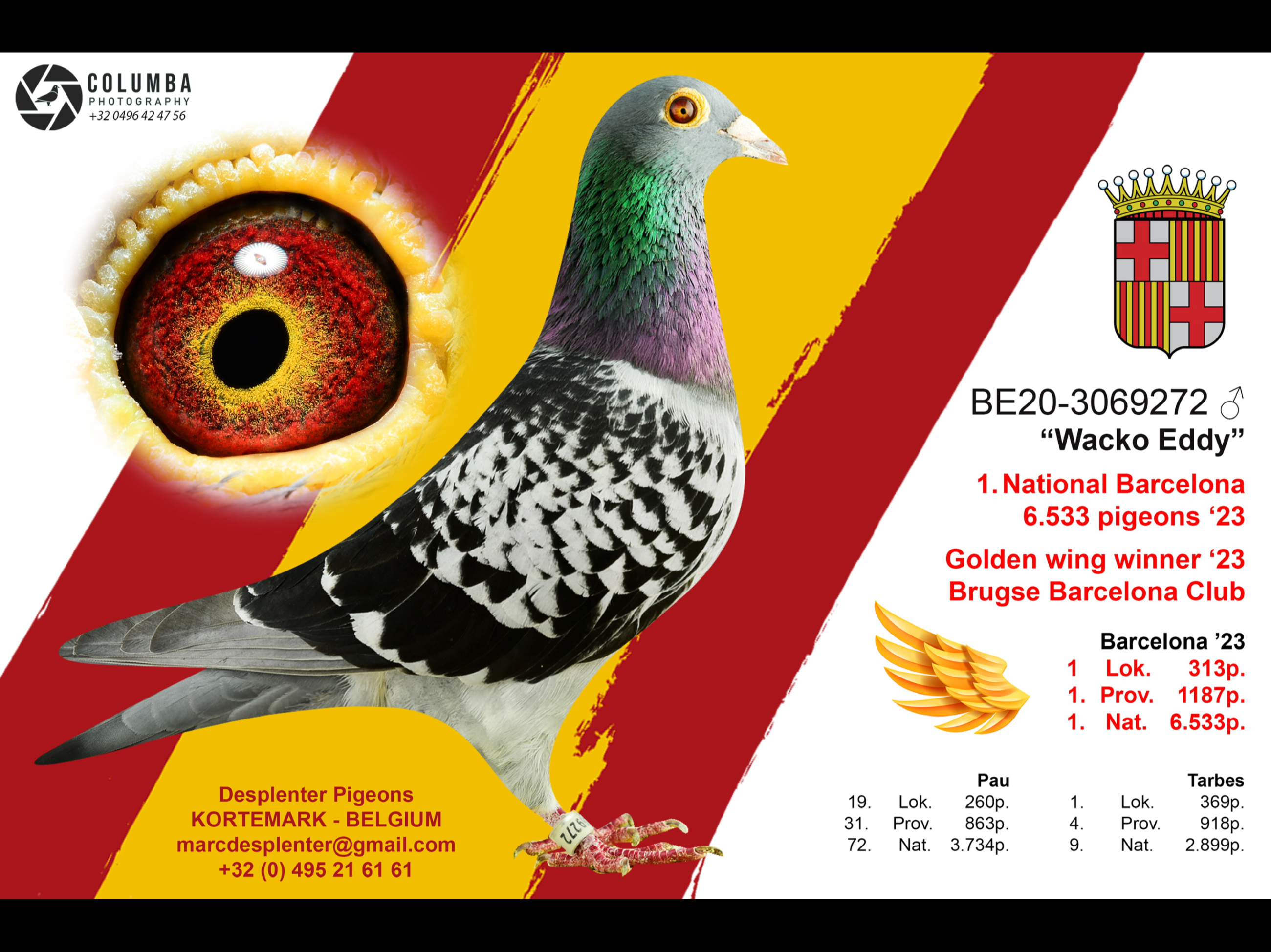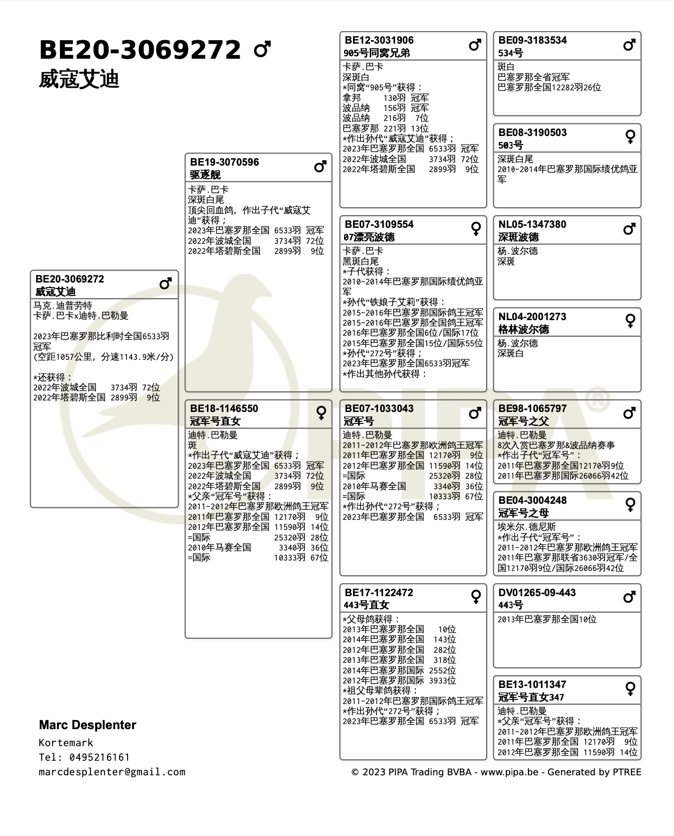 母亲是迪特·巴勒曼的“冠军号”直女,“冠军号”这也是一羽无与伦比的长距离赛鸽,它在2011年、2012年参与巴塞罗那千公里,并斩获佳绩,荣获2011年巴塞罗那12170羽全国9名,2012年巴塞罗那11590羽全国14名、25320羽国际28名。凭借此,它轻松获得了2011-2012年巴塞罗那国际鸽王冠军。