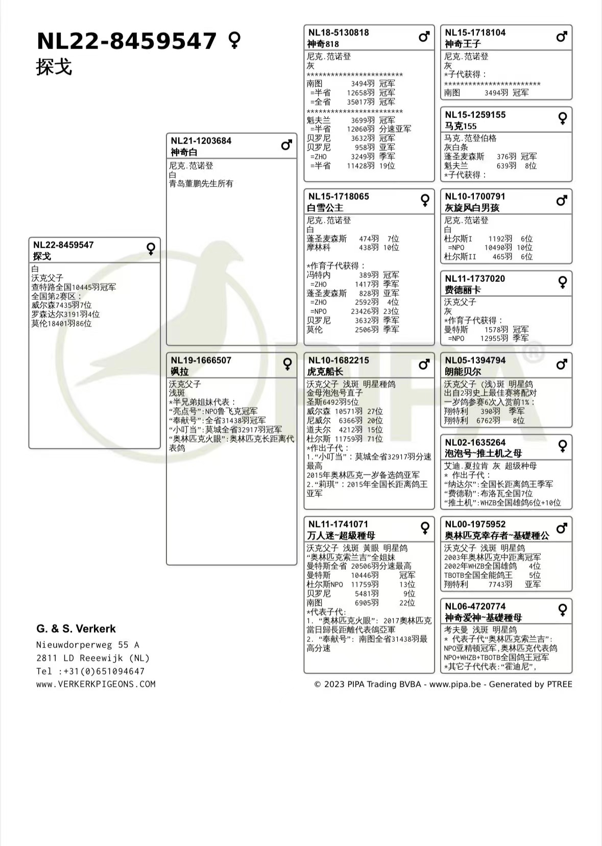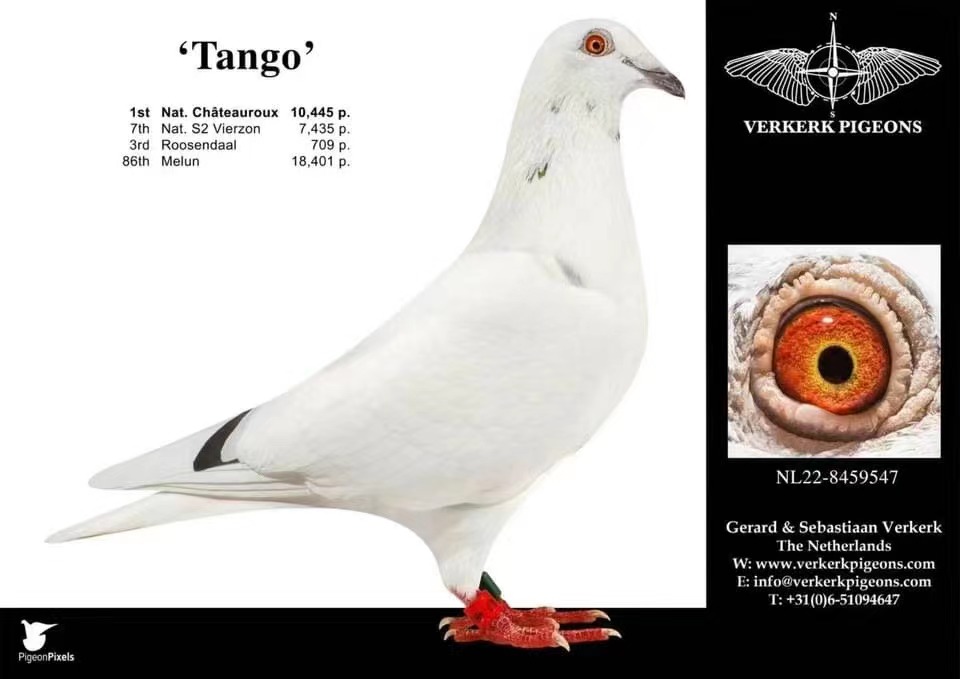 荷兰沃克父子夺得2023年8月5日查特路全国10445羽冠军,冠军鸽环号NL22-8459547,白,雌,飞行620公里,分速1850米/分,取名“探戈”。