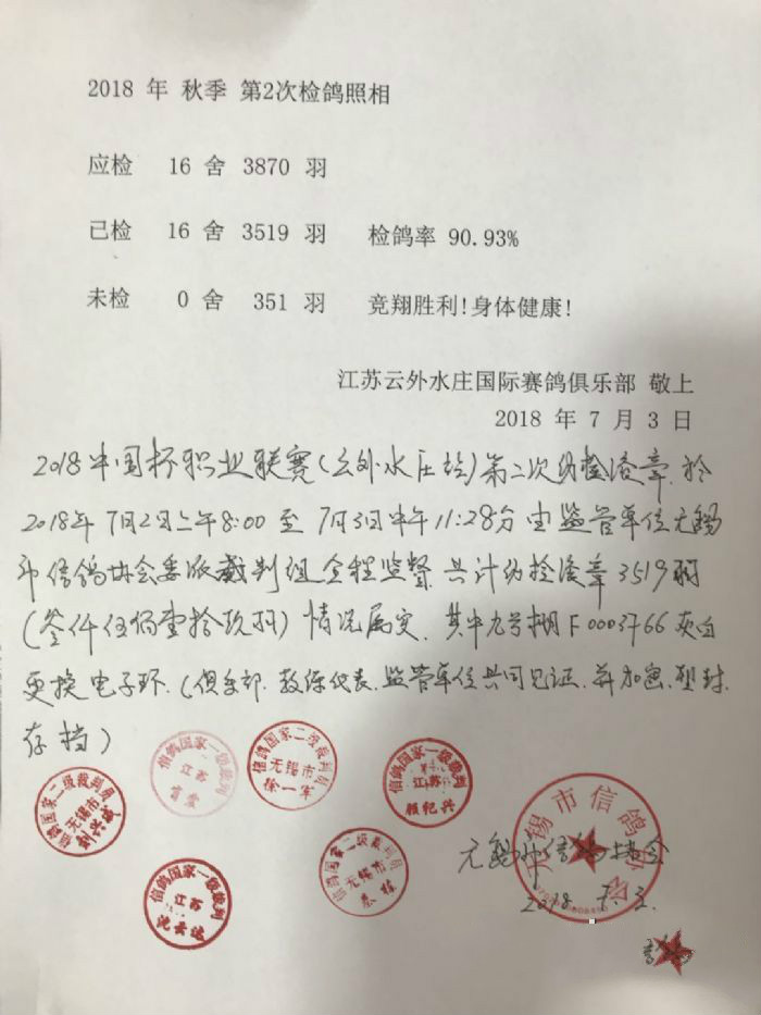 2018年秋“中国杯”云外水庄站四关鸽王大奖赛第二次注册滚章于2018年7月2日八时在俱乐部办公楼乒乓室举行,本次注册将对赛鸽进行滚章、照相,电脑留档并上网,本次检鸽率达91% 。本次注册全程由无锡鸽协派专门裁判组人员监督。以下是此次滚章现场图片: