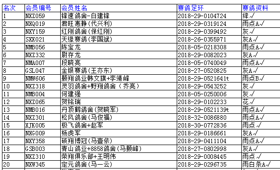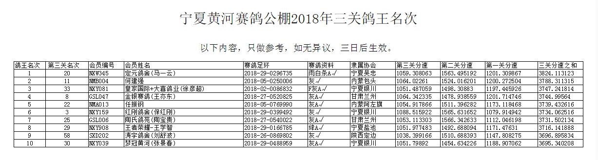 随着决赛顺利落幕,三关鸽王由此诞生,决赛中获得20名的定元鸽舍(马一云)斩获三关综合鸽王头衔。以下是三关鸽王名次: